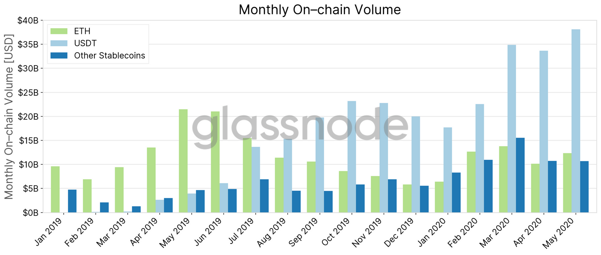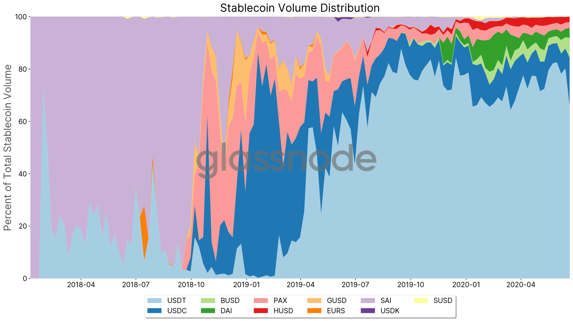Desde mediados del 2019, USDT ha ascendido casi sin competidores: En mayo del 2020 el 79,1% de todo el volumen de monedas estables en Ethereum contenía USDT, seguido de USDC (8,9%), BUSD (5,0%), DAI (3,2%), PAX (2,6%), y HUSD (2,5%). Todas las demás no llegan a sumar el 1% del total.