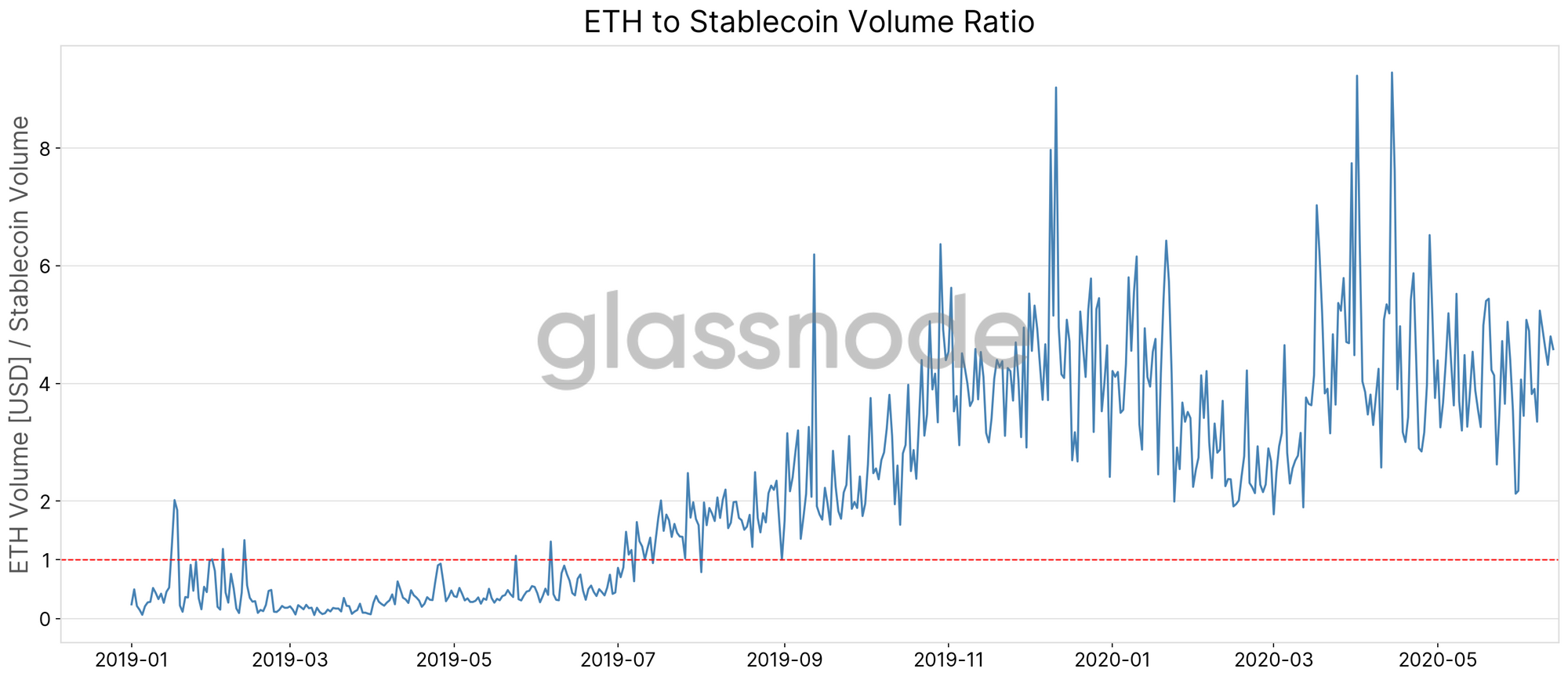 Si las juntamos, el volumen de monedas estables que transita en la red de Ethereum superó al volumen que se desplaza de ETH pasada la mitad del 2019, y en el 2020 ya era 5 veces superior.