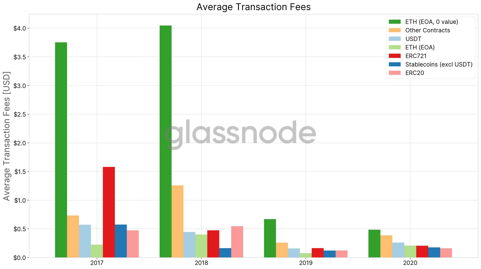 En el 2020, más de la mitad de todas las comisiones se empleaban en contratos que no eran ni ERC20 ni ERC721 (52,4%), seguido por USDT que creció de virtualmente cero a comienzos del 2019 hasta ocupar un año y medio después casi el 20%. Otros contratos ERC20 sumaban el 12,6%, y las transferencias de ETH entre Carteras Externas suponían el 11,5%.