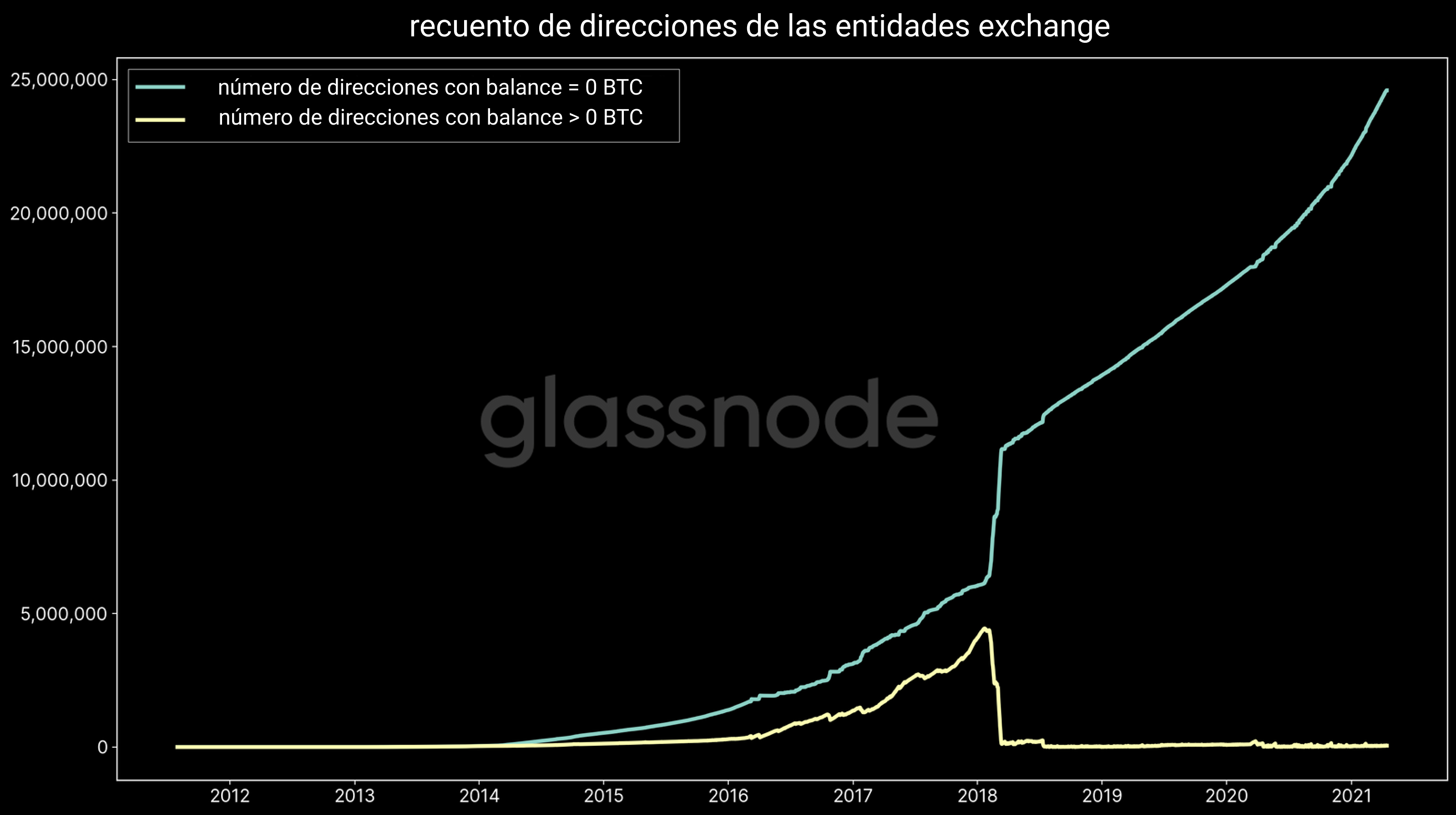Por ejemplo, la Figura 2 nos mostraba el número de direcciones del network asociadas a un exchange específico. Ilustra el continuo crecimiento de la constelación de carteras pertenecientes a los exchanges, actualmente cercana a los 25 millones de direcciones. Hay que tener en cuenta que la mayoría de esas direcciones están vacías, aunque la cantidad de direcciones con balance distinto a cero se haya mantenido por debajo de las 100.000. Esto es sólo un ejemplo de la naturaleza altamente dinámica y en constante transformación de las carteras de los exchanges.