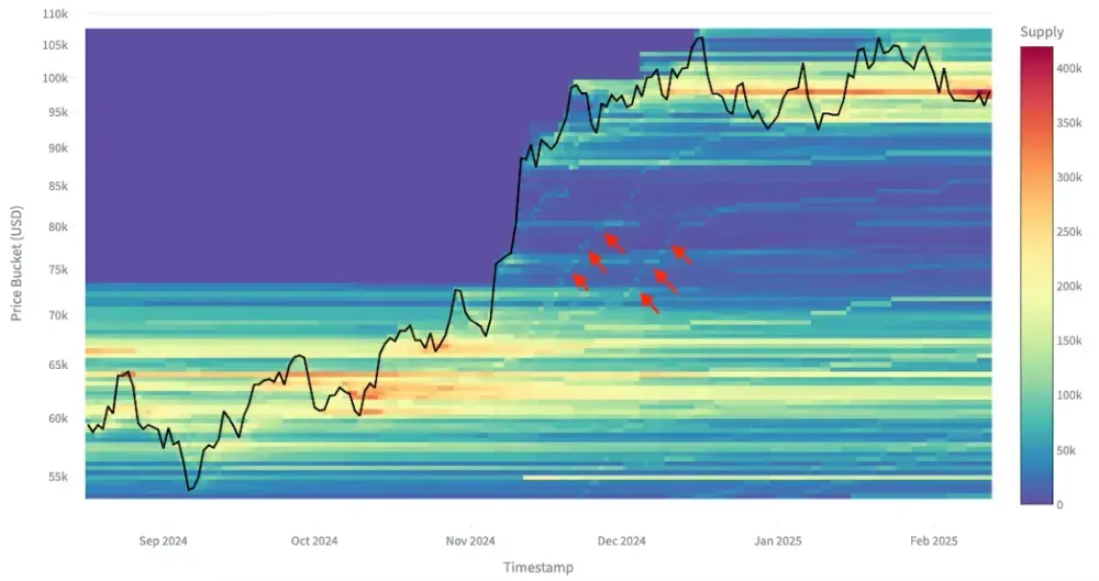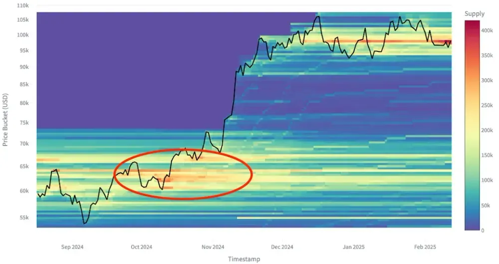 Ejemplo: En octubre del 2024, se produjo una fuerte acumulación de Bitcoin entre los 60.000$ y los 65.000$, reflejada en tonos naranja intenso, lo que indica una elevada concentración de oferta en esa zona. Conforme el precio comenzó a subir en noviembre, estos tonos fueron degradándose de naranja a amarillo y, posteriormente, a verde, señalando que los inversores que compraron en los 65.000$ estaban recogiendo ganancias y distribuyendo sus monedas a medida que el precio escalaba al alza.