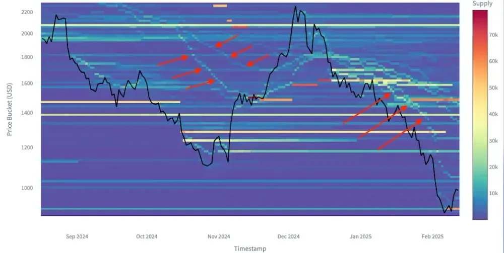 - Eje vertical (Coste Base): Cada "corte horizontal" representa un rango de precios en el que una parte de la oferta de esos tokens se movió por última vez.
