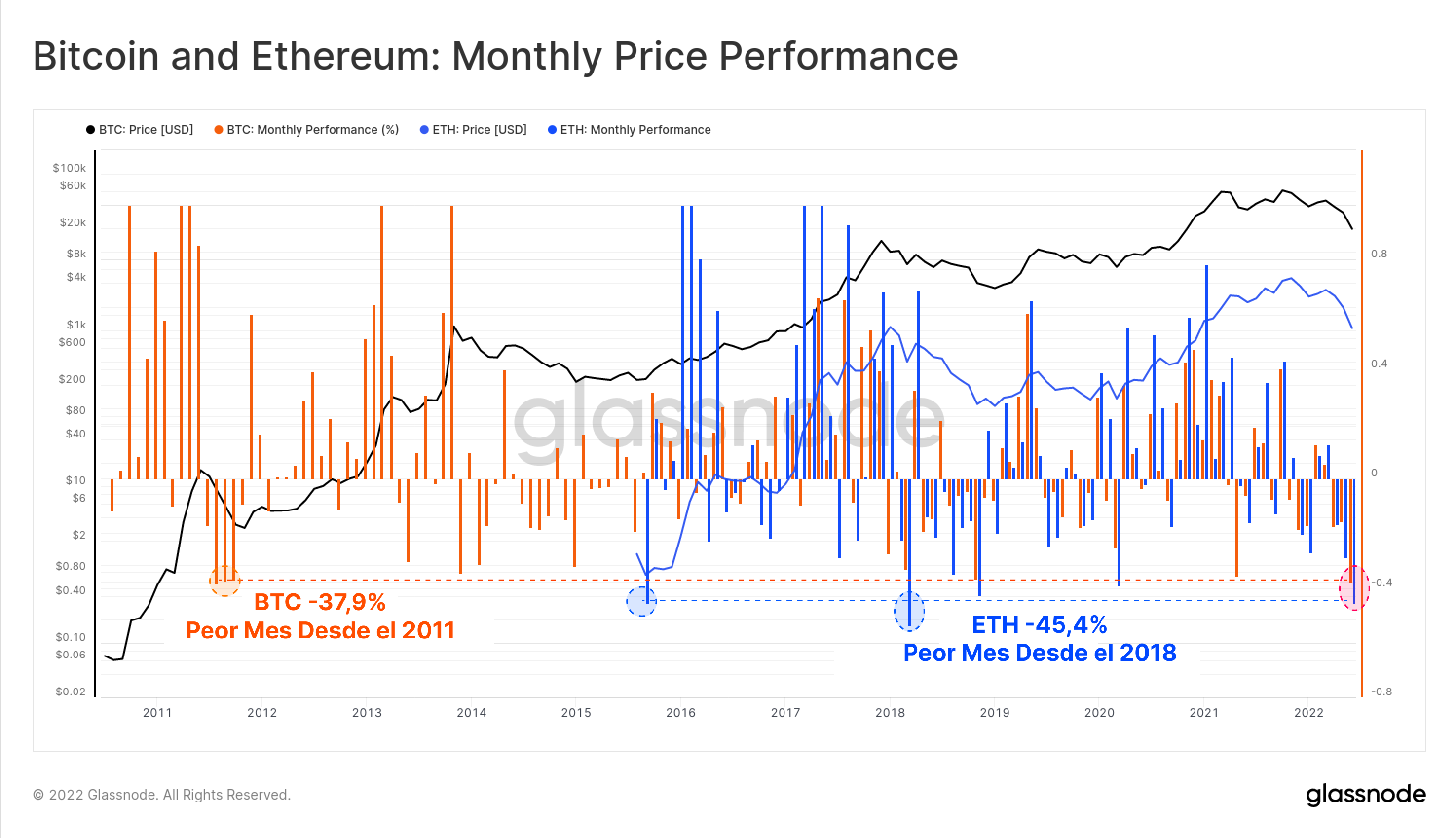 El año 2022 ha supuesto un tremendo reto para todo inversor, hemos presenciado la caída del 75% de BTC desde su máximo histórico, y ETH más de un 80%. Antes del fiasco FTX, el cual hemos cubierto extensamente, junio en particular fue uno de los peores meses registrados para ambos activos:
