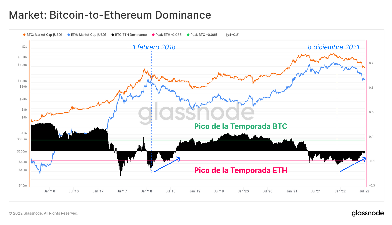 La siguiente gráfica muestra la dominancia relativa entre la Capitalización de Mercado de Bitcoin y Ethereum, donde observamos que desde comienzos de diciembre del 2021, el capital ha ido rotando a favor de BTC. Esta tendencia es de estructura similar a la de comienzos del mercado bajista del 2018 y vino seguida de casi tres años con un Bitcoin relativamente predominante.