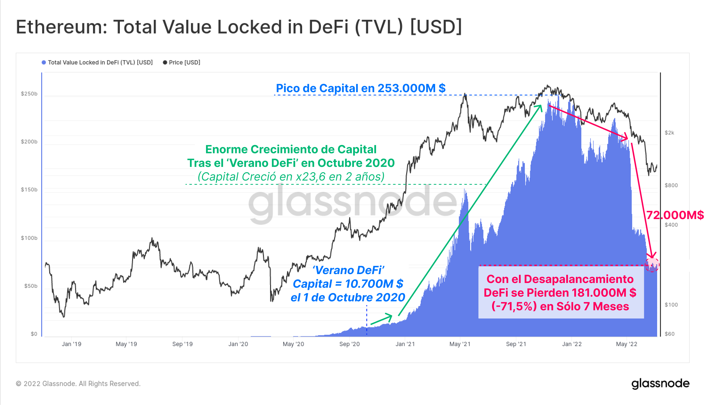 Este declive es una función que mezcla el descenso de la valorización de los propios token y la reducción del apalancamiento agregado (tanto el voluntario, como el forzado por liquidaciones). Los dos han ejercido peso sobre el precio de ETH como las rutas de escape líquidas que han utilizado muchos inversores.