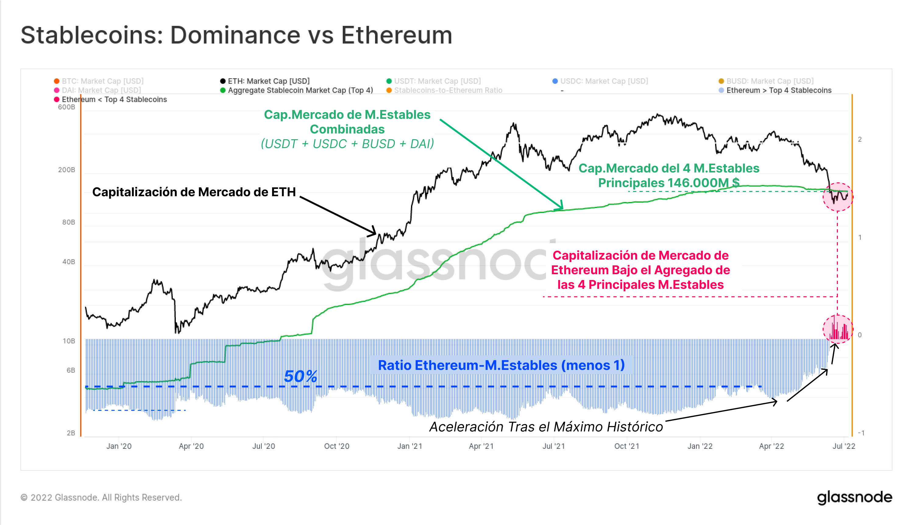 En estos últimos dos años, la capitalización conjunta de las cuatro principales monedas estables (USDT, USDC, BUSD y DAI) ha rondado de máximo en torno al 50% de la Capitalización de Mercado de Ethereum. Sin embargo, con tantísimo capital escapando de los activos crypto que va a parar a estas monedas estables, el valor agregado de las monedas estables ya ha superado al del propio Ethereum.
