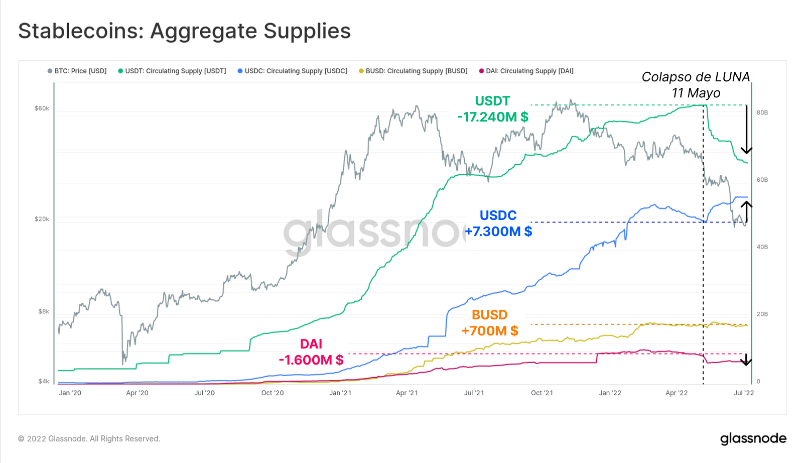 - Tether (USDT) en particular sufrió una increíble reducción en su oferta en circulación de nada menos que -17.240M $ (caída del 20% desde su máximo histórico) entre mayo y junio del año pasado, consecuencia directa de la gran cantidad de canjes por fiat que se efectuaron.