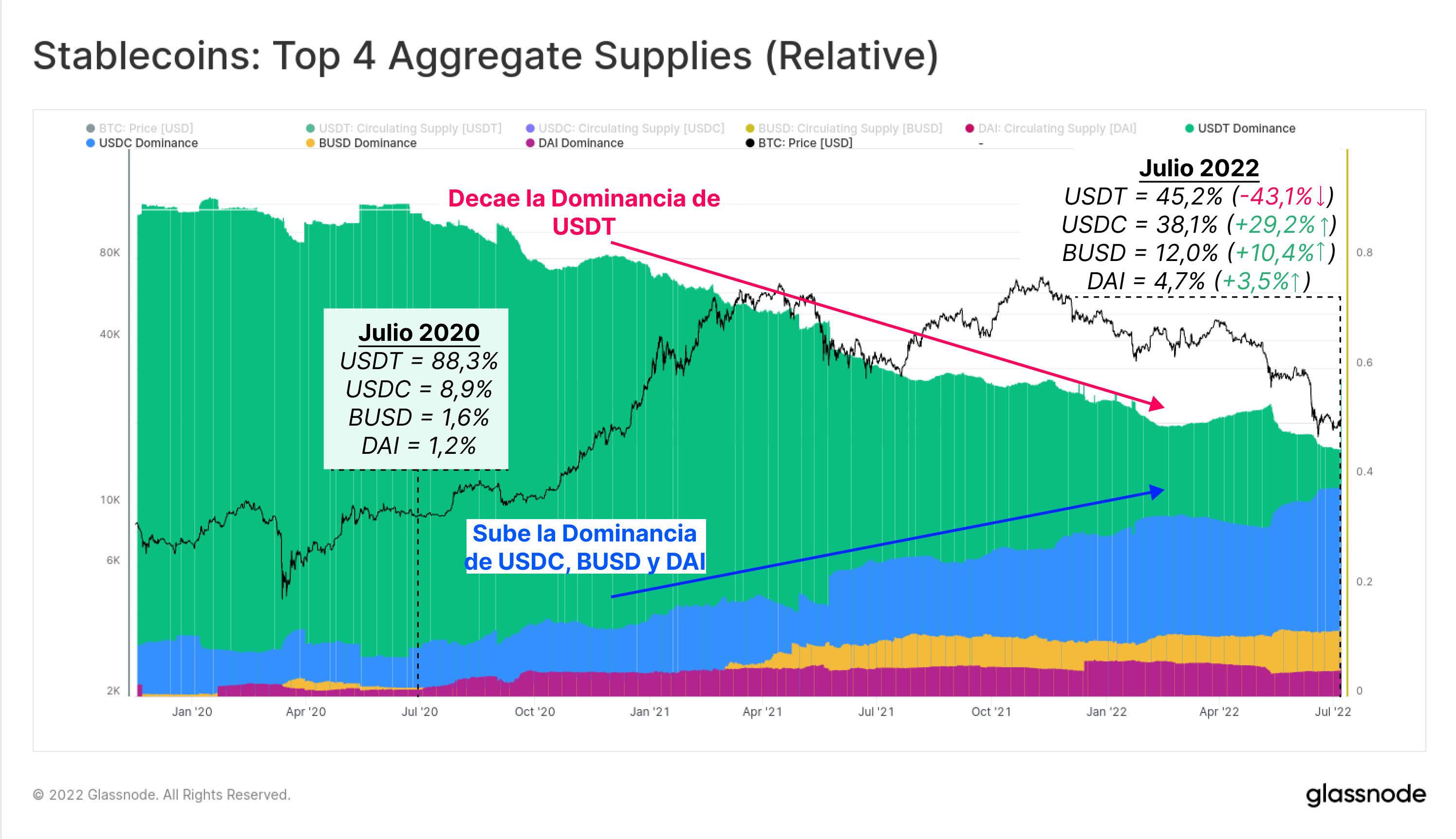 - La dominancia de BUSD ha tenido el crecimiento más agresivo, elevando su cuota de mercado en x7,5 hasta representar el 12% de la oferta.