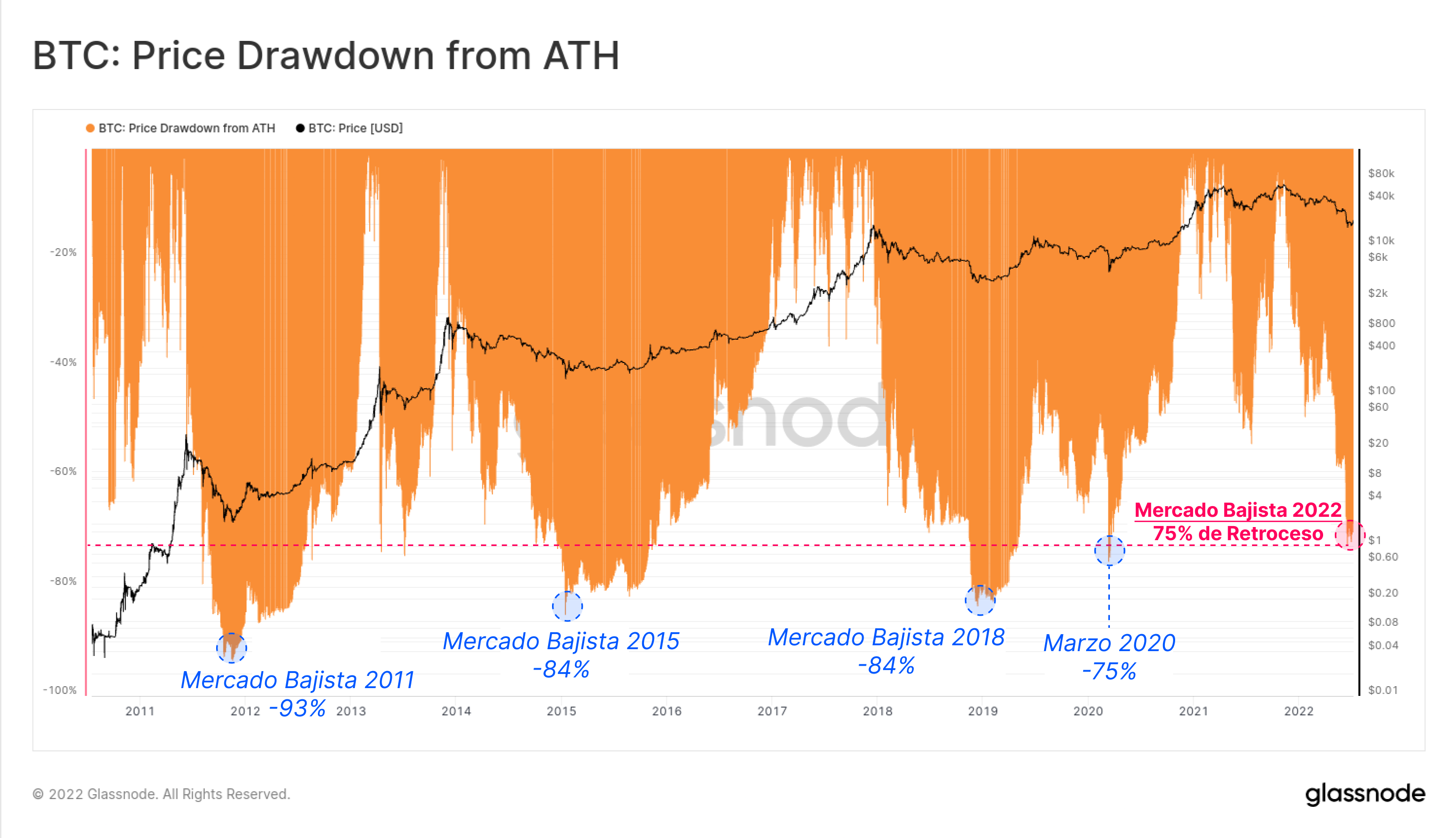 Como mencionamos en la introducción, el 2022 ha sido un año difícil, y ni siquiera el líder de mercado Bitcoin ha salido ileso. El precio de BTC se ha llegado a desplomar un 75% desde el máximo histórico de 68.300$, inicialmente imprimiendo un mínimo relativo de 17.600$ el 18 de junio.