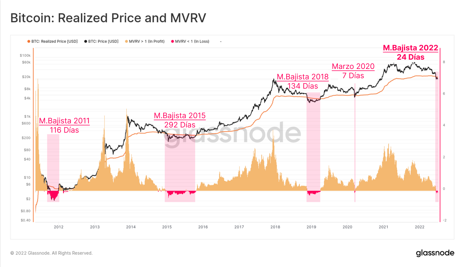 En todos los mercados bajistas de Bitcoin el precio cayó por debajo del Precio Realizado durante una media de 180 días (a excepción de marzo del 2020 que sólo aguantó 7 días en esas condiciones). Cuando el precio spot se sitúa bajo el precio realizado, el Ratio VMVR mostrará un valor inferior a 1. Es indicativo de que el inversor medio de Bitcoin es dueño de monedas que adquirió a precios más altos, y por tanto soporta unas pérdidas no realizadas.