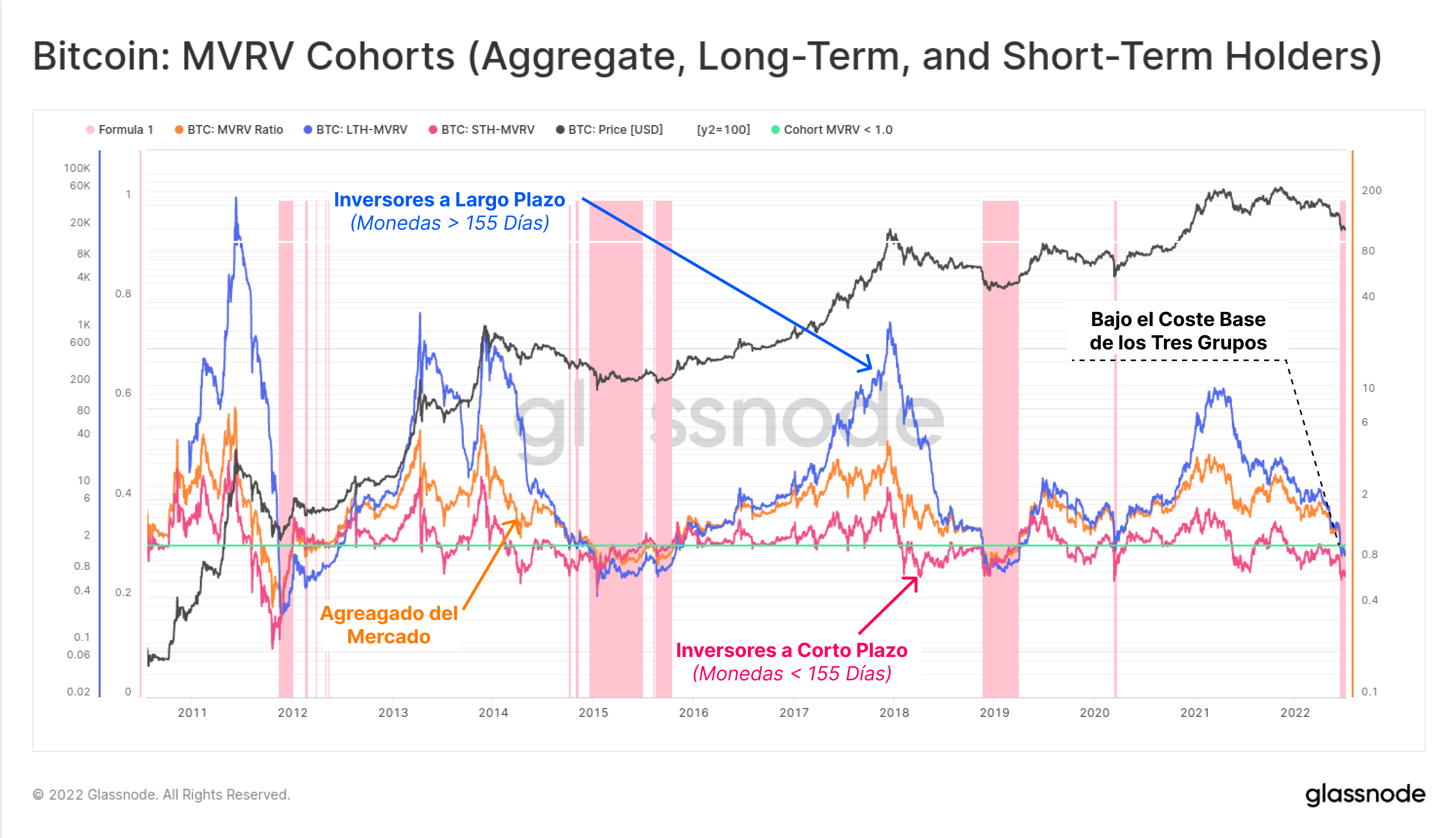 - Los Inversores a Corto Plazo (rosa) quienes llevan con sus monedas menos de 155 días, y quienes estadísticamente son los más propensos a reaccionar y gastar monedas ante los cambios de volatilidad del mercado.