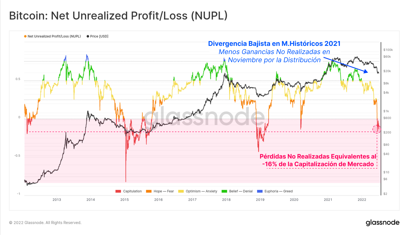 Según el tamaño del mercado de Bitcoin crece, es razonable esperar que también aumente la magnitud de las ganancias o pérdidas potenciales denominadas en dólares americanos. En el transcurso del ciclo 2021-22, han ocurrido seis grandes eventos de capitulación, en los que los inversores realizaron unas pérdidas históricamente grandes en el blockchain.