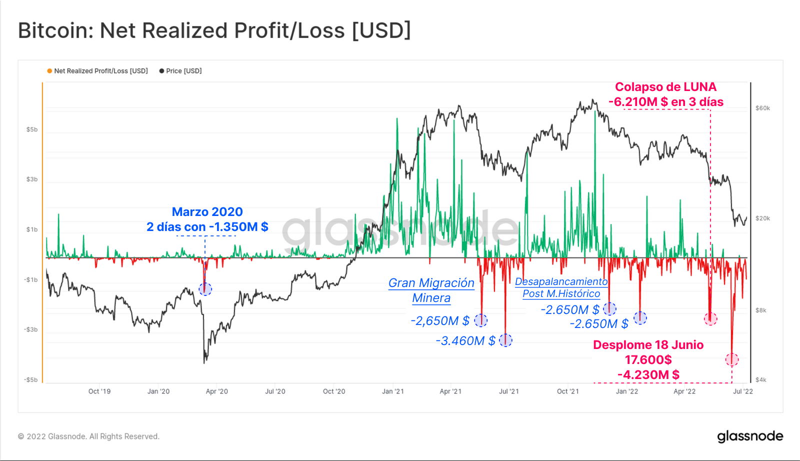 - De mayo a junio del 2022 la sequía crediticia se contagió por todo el mercado. Y a medida que colapsaba el proyecto LUNA-UST a mediados de mayo del 2022, los inversores de Bitcoin realizaron unas pérdidas netas de más de -6.210M $ en un lapso de 3 días. El segundo suceso ocurrió el 18 de junio cuando el precio de Bitcoin se desplomó hasta los 17.600$, estableciendo en aquel momento el récord en pérdidas netas realizadas de nada menos que 4.230M $. Sucedía al tiempo que Bitcoin perforaba por primera vez en la historia el máximo histórico del anterior ciclo de mercado.