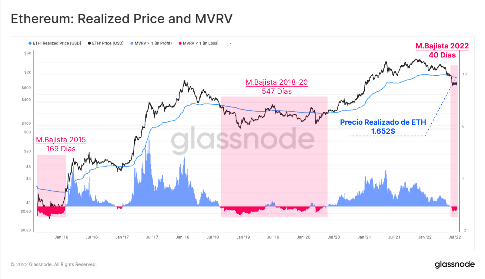 Los inversores de Ether también han estado sosteniendo monedas por debajo de su coste base, ya que el precio spot perforó los 1.200$ y el Precio Realizado rondaba los 1.650$. En el mercado bajista del 2018-20, fueron 547 días los que se aguantaron por debajo del coste base (con dos repuntes de desahogo entre medias).