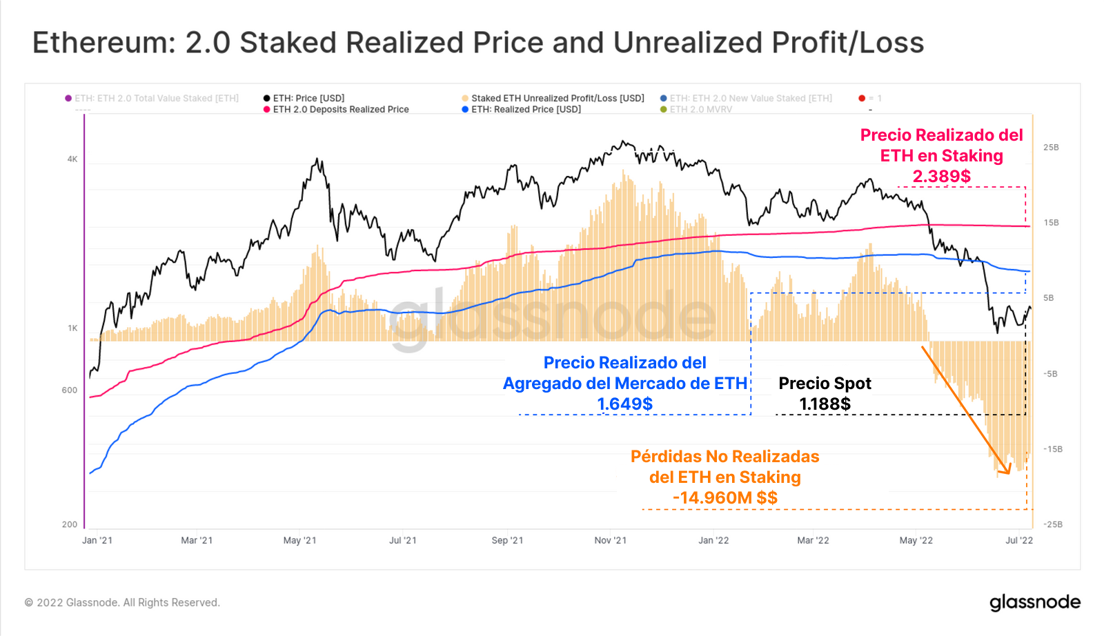 Con los más de 13M de ETH en staking que ya había a mediados de año, las pérdidas no realizadas totales atrapadas en los contratos de depósitos de ETH 2.0 sumaban 14.960M $.