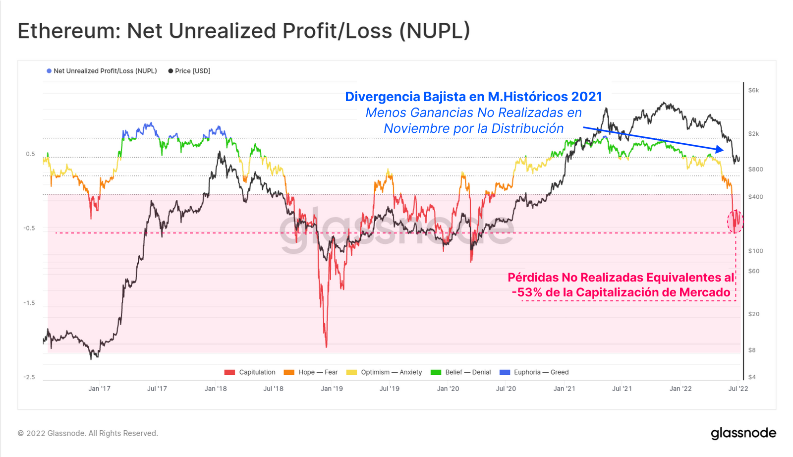 Hablando ahora de los índices de rentabilidad del mercado en su conjunto, encontramos que las Pérdidas Netas No Realizadas de los inversores de ETH son notablemente peores que las de su contraparte en Bitcoin. Se aprecia una divergencia bajista muy similar entre las cumbres del 2021, y para mediados del 2022 el mercado ya soportaba unas pérdidas del 53% de la Capitalización de Mercado.