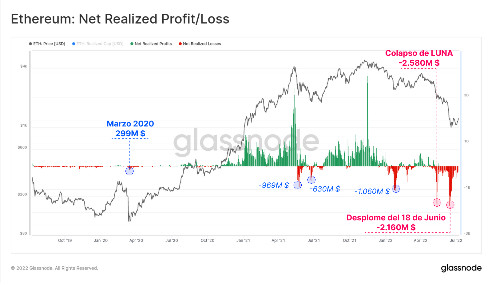 Con una rentabilidad tan extremadamente negativa en todo el espectro inversor de Ethereum, hubo dos reacciones con capitulaciones históricamente grandes en el transcurso de mayo y junio. Aquí estamos teniendo en cuenta únicamente los tokens de ETH para identificar capitulaciones diarias de -2.580M $ durante el colapso de LUNA y luego -2.160M $ adicionales durante el desplome del 18 de junio.