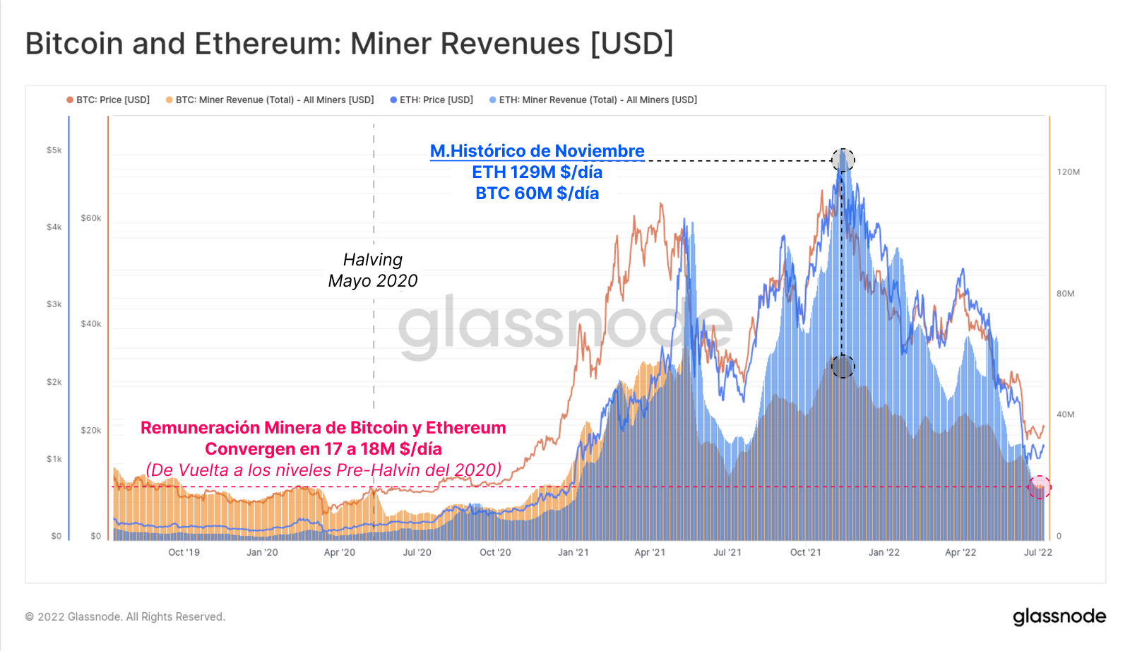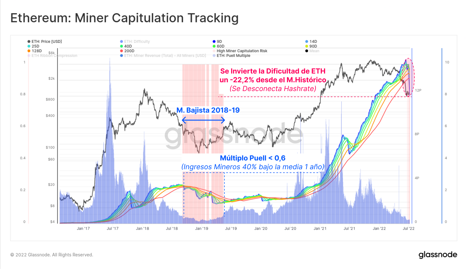 Pero vemos una dinámica interesante más que afecta a los mineros. Dado que este análisis nos traslada en el tiempo a junio del 2022, hay que tener en cuenta que la comunidad de Ethereum cada vez estaba más próxima a la Fusión, y en ese momento el blockchain de Ethereum pasa del sistema por Prueba de Trabajo al mecanismo de consenso por Prueba de Participación. Por ello, posteriormente vimos una transición en la que el conglomerado minero migró para minar otras monedas, o vendió sus GPUs para destinarlo a otros usos (gaming, AI, etc.).