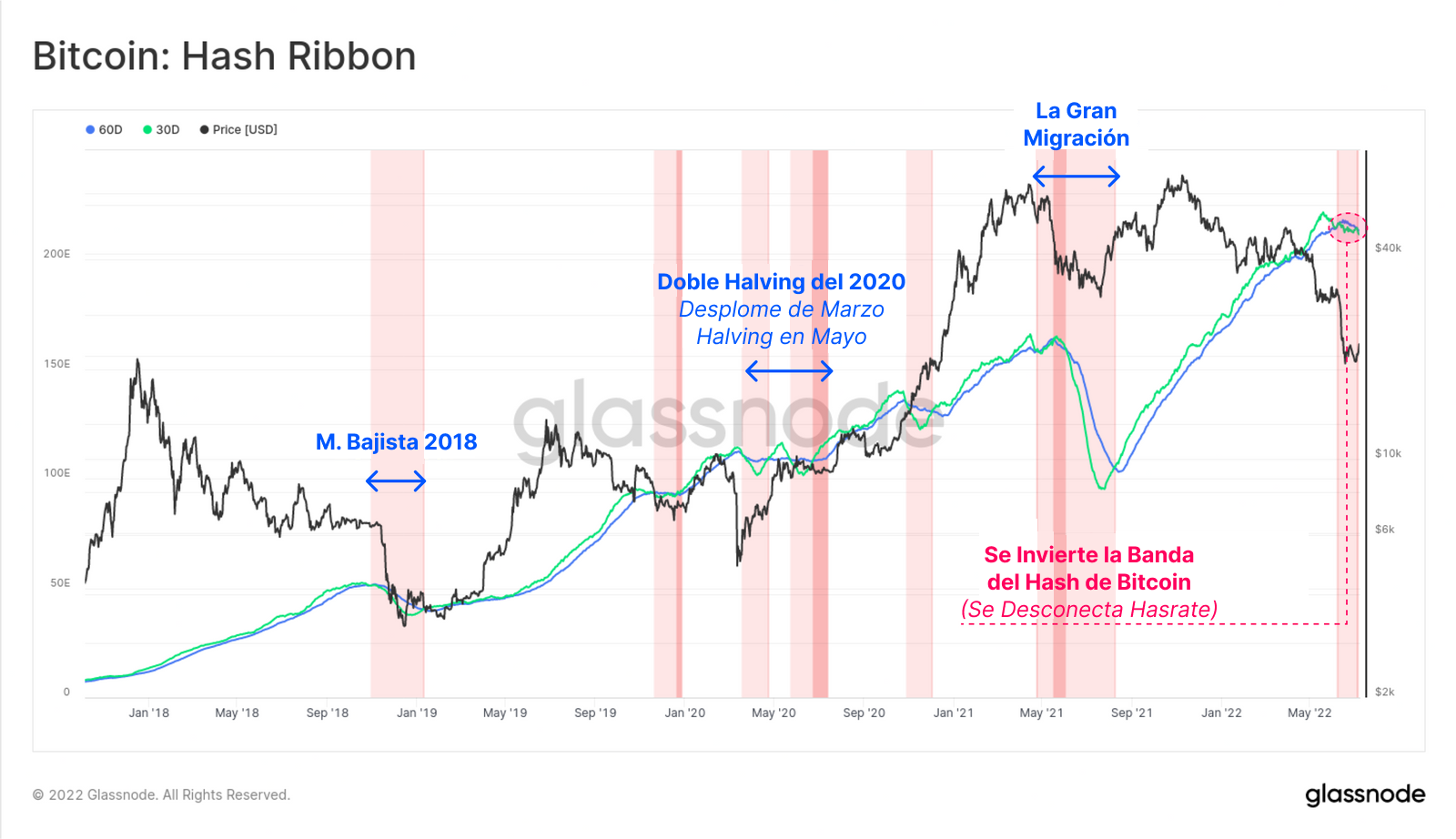 En el pasado hemos visto situaciones parecidas durante los mínimos del mercado bajista del 2018, y mas tarde durante el evento del halving del 2020 (primero el precio se redujo a la mitad con el desplome de marzo del 2020, y luego el subsidio minero se redujo también a la mitad con el halving de mayo). El impacto que tuvo la Gran Migración también es observable entre mayo y julio del 2021.
