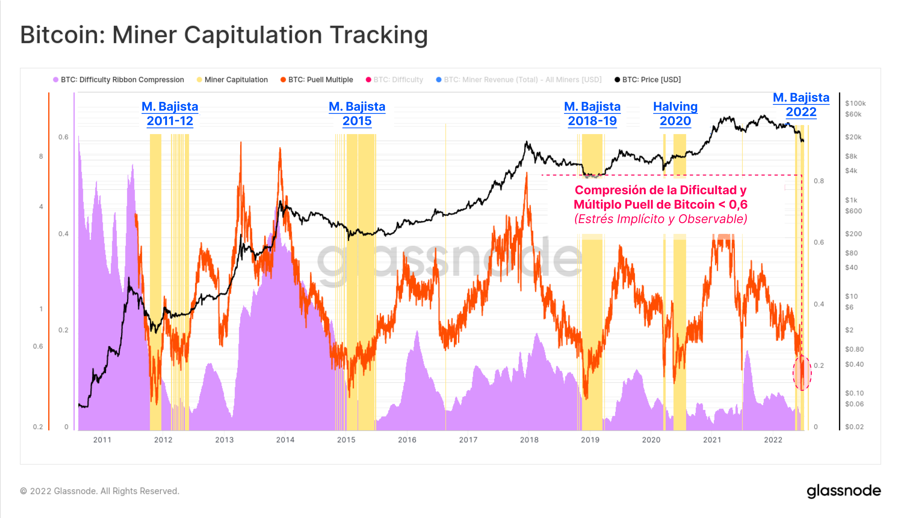 Para confirmar que efectivamente los mineros están bajo mucho estrés, podemos echar un ojo a un modelo que consta de dos partes para encontrar confluencias entre el estrés implícito de sus ingresos (Múltiplo Puell) y el evidente declive del hashrate (Banda de Compresión de la Dificultad).