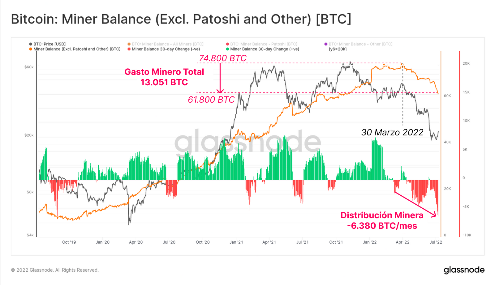 Esta ha sido la distribución minera más agresiva desde el 2019. Podríamos incluso esperar que vaya en aumento a no ser que los precios sigan recuperándose, y/o hasta que los mineros con mayor poder adquisitivo consigan la suficiente dominancia dentro del network del hashrate. Dado que aún mantienen 61.800 BTC en sus arcas, seguimos bajo riesgo de que se produzcan mayores distribuciones mineras.