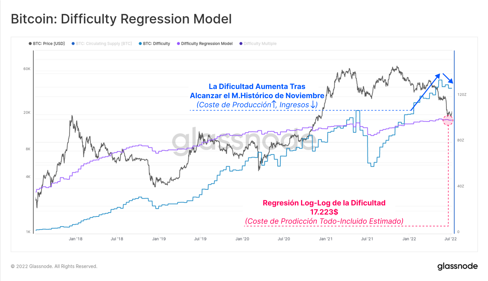En la práctica esto ha causado que aumenten los costes de producción de BTC, exactamente cuando orbitábamos precios máximos e inmediatamente después estrenamos la tendencia bajista. Mediante un modelo de regresión log-log, se puede estimar el coste medio todo-incluido de minar BTC en torno a los 17.200$. Interesantemente, el gran desplome del 18 de junio rebotó sobre este mismo modelo en los 17.600$, indicando que el precio de Bitcoin había regresado a valores cercanos a su coste de producción medio, un fenómeno que con frecuencia se repite en muchas materias primas.