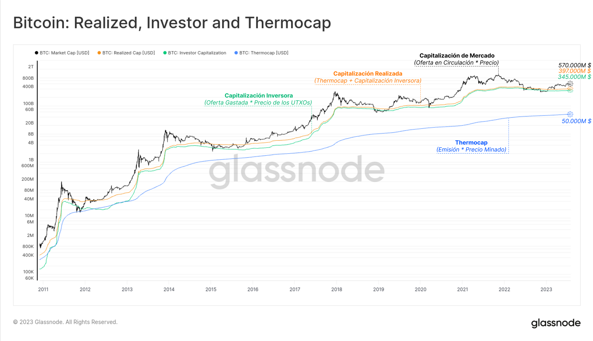 - Capitalización Realizada (397.000M $) que es el valor agregado 'albergado' o 'almacenado' en BTC.