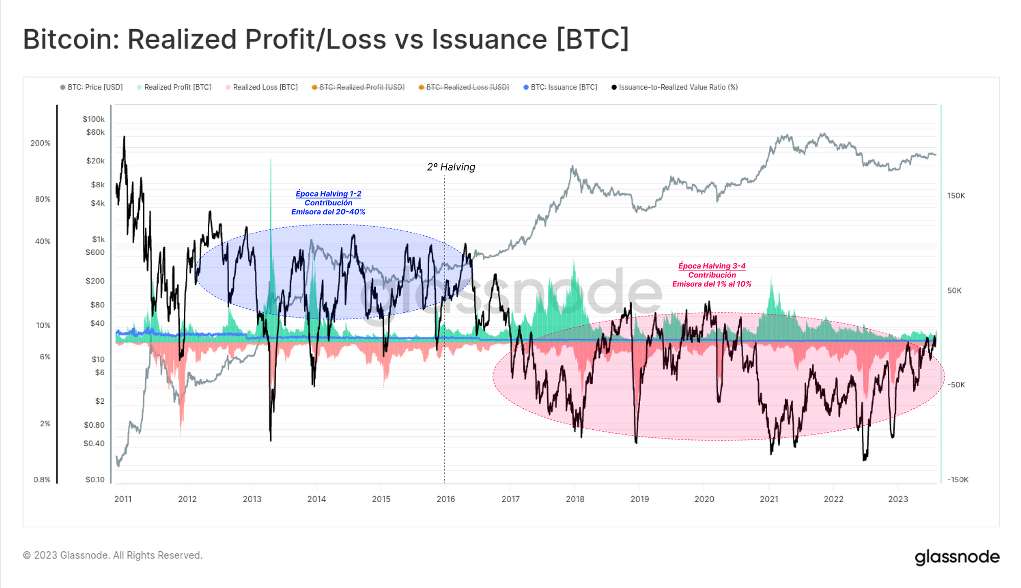En la actualidad, el Thermocap representa sólo el 8,7% del capital total almacenado dentro de la Capitalización Realizada. La siguiente gráfica muestra que hasta el segundo halving (en 2016), la emisión (azul) representaba aproximadamente entre el 20% y el 40% del valor económico que entraba/salía de Bitcoin a diario.