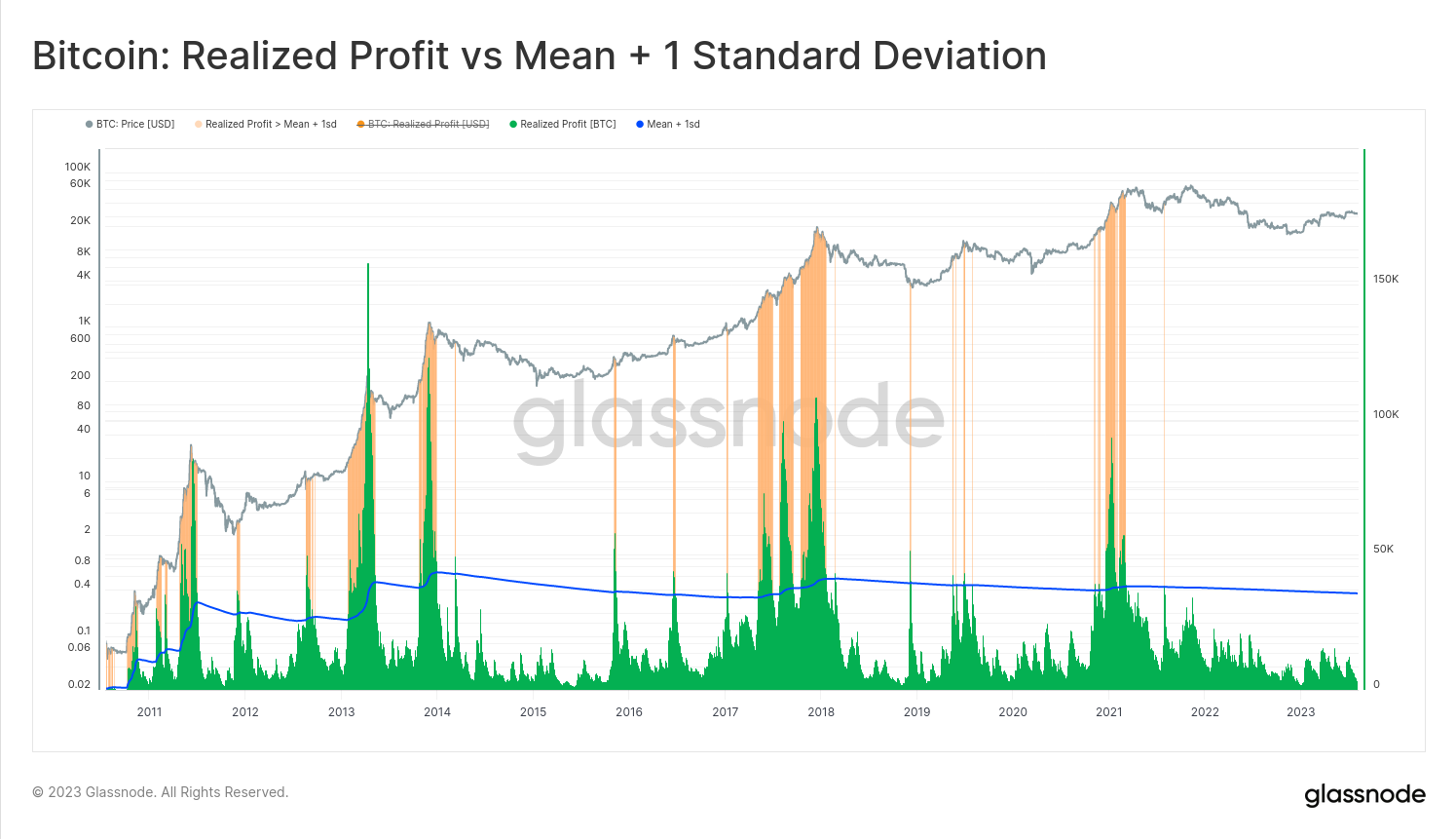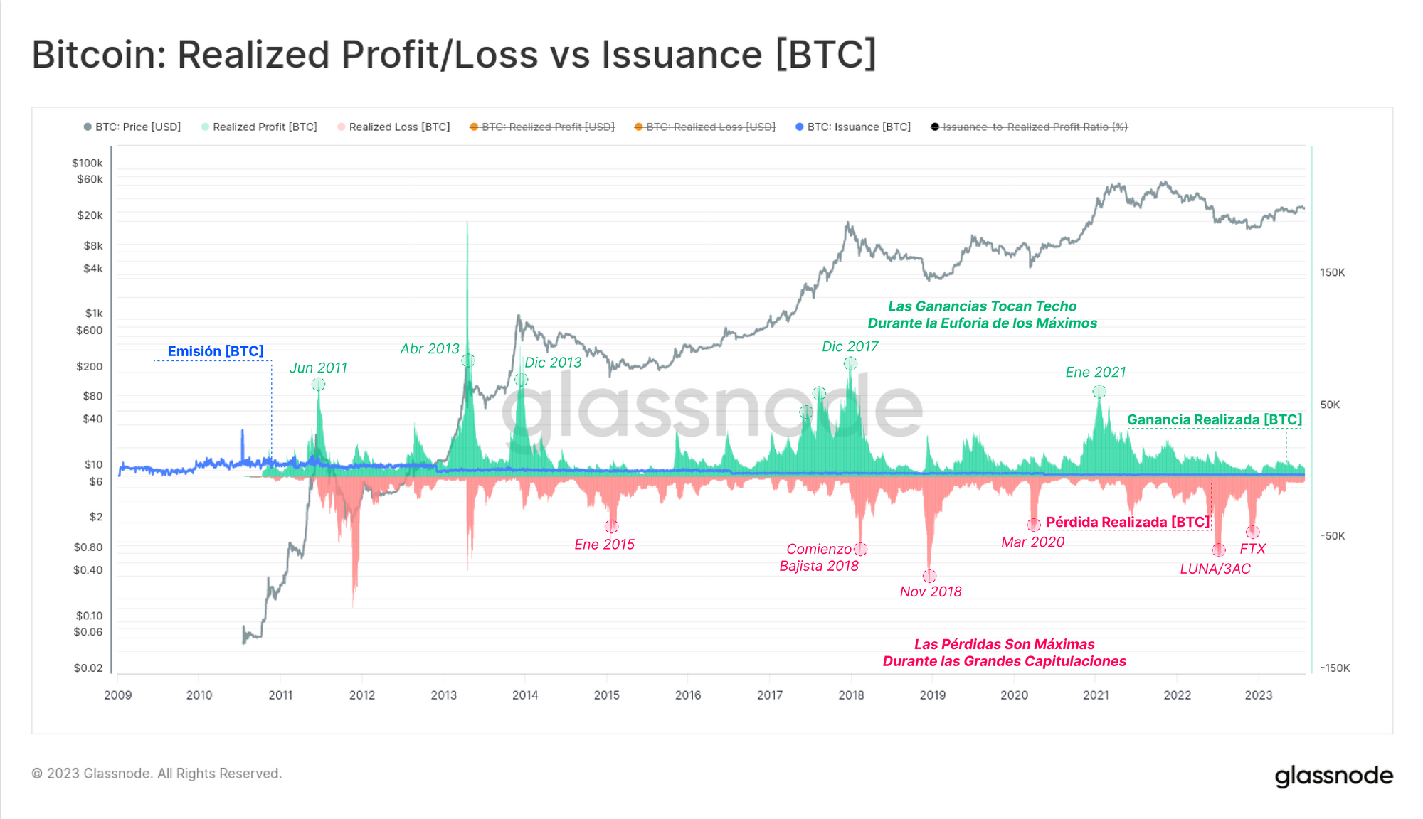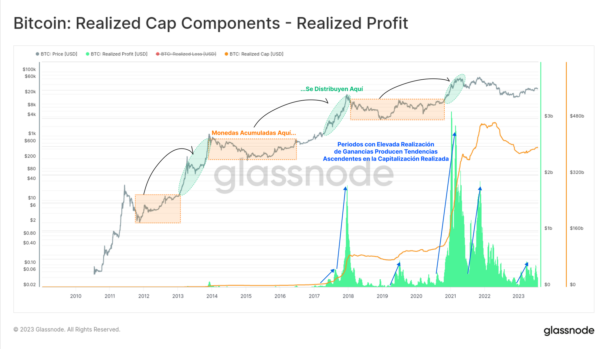 - Las Ganancias Realizadas predominan durante las tendencias alcistas a nivel macro y alcanzan su punto álgido alrededor de los máximos de mercado, tanto locales como globales. Esto demuestra cómo funciona el mecanismo de toma de beneficios que eventualmente termina por saturar la demanda entrante (mediante una corrección o un cambio de tendencia a gran escala).