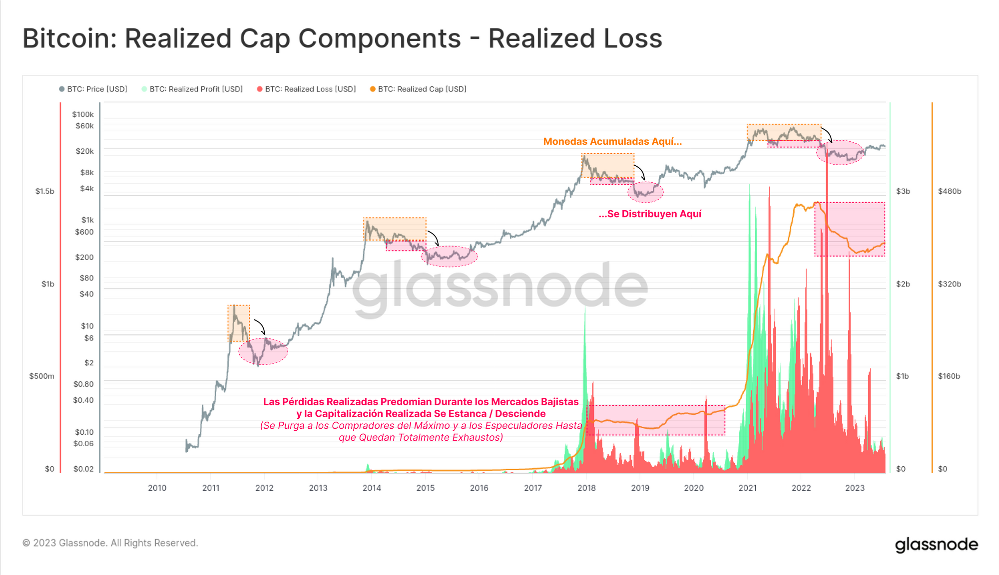 La Capitalización Realizada a menudo se estanca o disminuye gradualmente durante de los mercados bajistas. La siguiente gráfica muestra cómo solemos mantener niveles elevados de pérdidas realizadas durante períodos de tiempo más largos, ya que el mercado tiene que digerirlas y consolidar a lo largo de todo el mercado bajista. A medida que la atención de los especuladores y nuevos inversores disminuye, el grupo de HODLers con mayor convicción e insensibilidad al precio comienza a resurgir y asumir más riesgos, trabajando arduamente en su labor de esculpir un nuevo fondo de mercado.