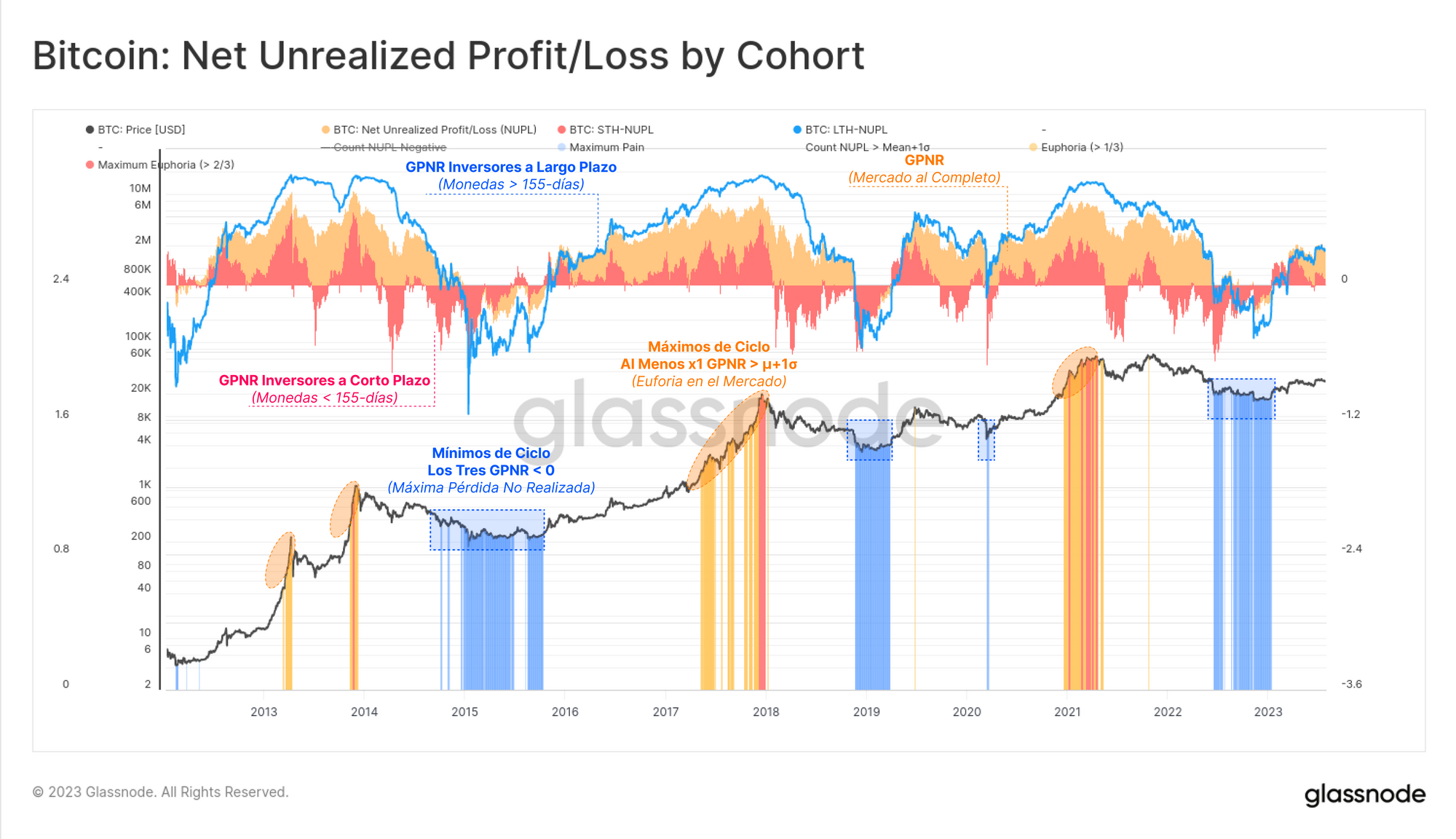 Una de las herramientas del blockchain más populares es la métrica de las Ganancias/Pérdida Netas No Realizadas (GPNR, o NUPL por sus siglas en inglés), que representa la ganancia/pérdida no realizada en la oferta monetaria en proporción a la capitalización de mercado del activo. Aquí presentamos las variantes del GPNR de tres grupos inversores: