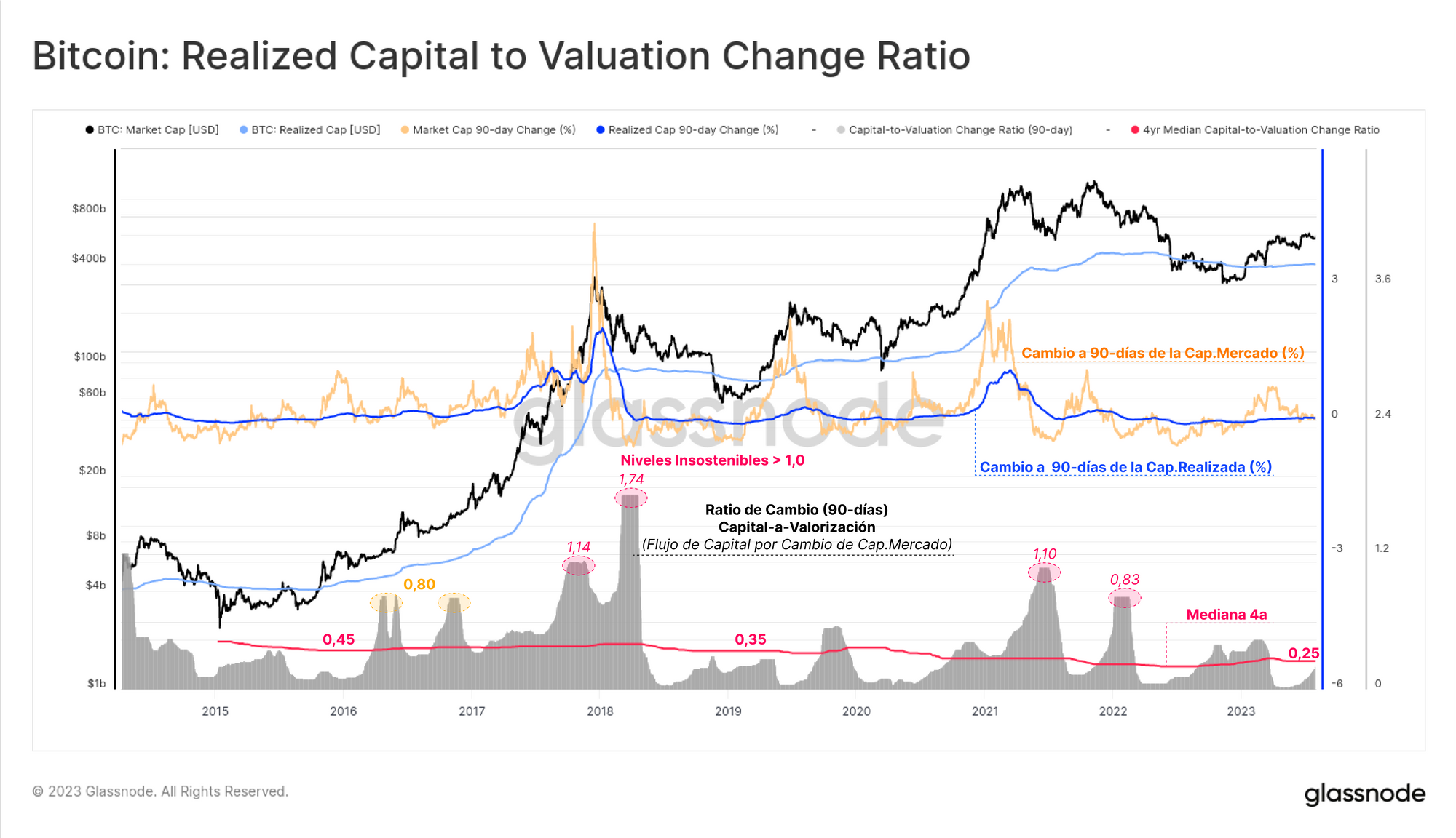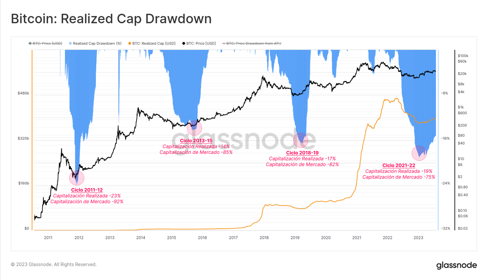 Esta observación sugiere que, aunque la valorización spot pueda disminuir en un -75% o más, las salidas de capital contante y sonante que experimenta el activo suelen ser de 3 a 4 veces menores en magnitud. Esto explica por qué históricamente Bitcoin ha establecido suelos de mercado en unos rangos de precios cada vez más elevados.