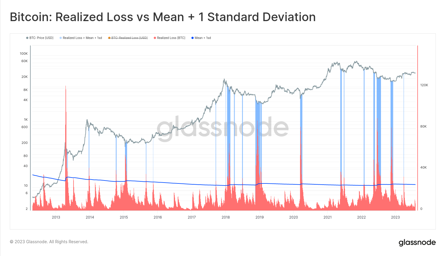 Hasta la fecha, los mercados bajistas de Bitcoin han tocado fondo de una forma bastante espectacular, con eventos de capitulación violentos y Pérdidas Realizadas extraordinarias. Tales capitulaciones se encuentran bien cuando uno busca períodos en los que las pérdidas realizadas [BTC] superan 1 desviación estándar.