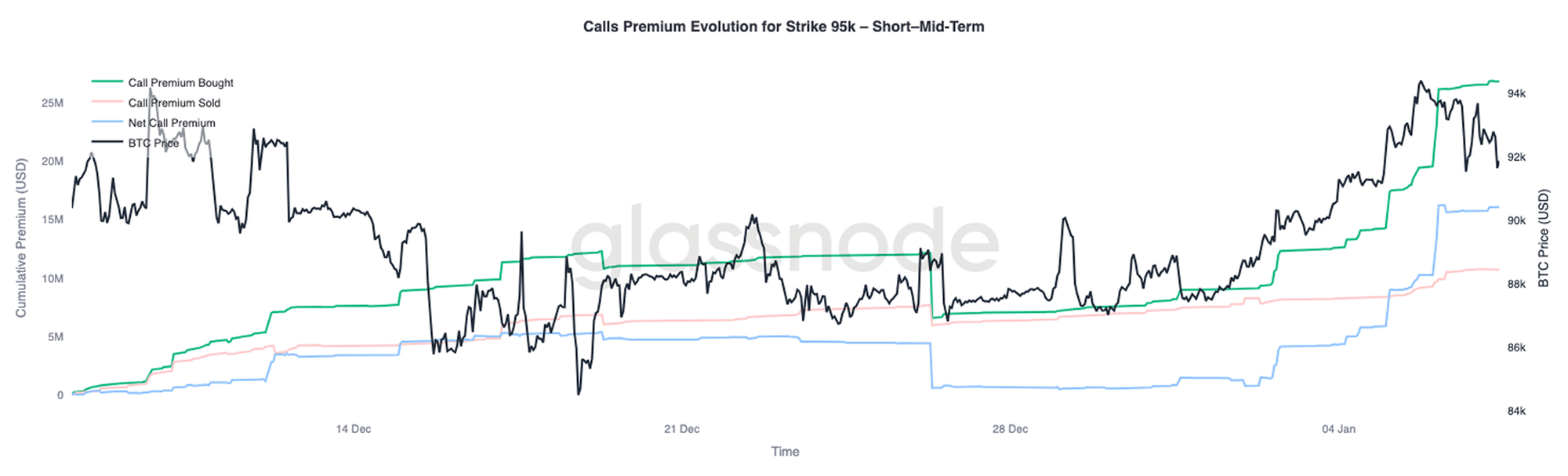 El strike de los 95.000$ en las calls se ha convertido en un excelente indicador para medir el grado de convicción del mercado a medida que evoluciona la acción del precio. Las compras de primas de calls comenzaron a acelerarse el 1 de enero, cuando BTC cotizaba cerca de los 87.000$, y esta tendencia se mantuvo de forma constante mientras el precio se acercaba al reciente máximo local de 94.400$.