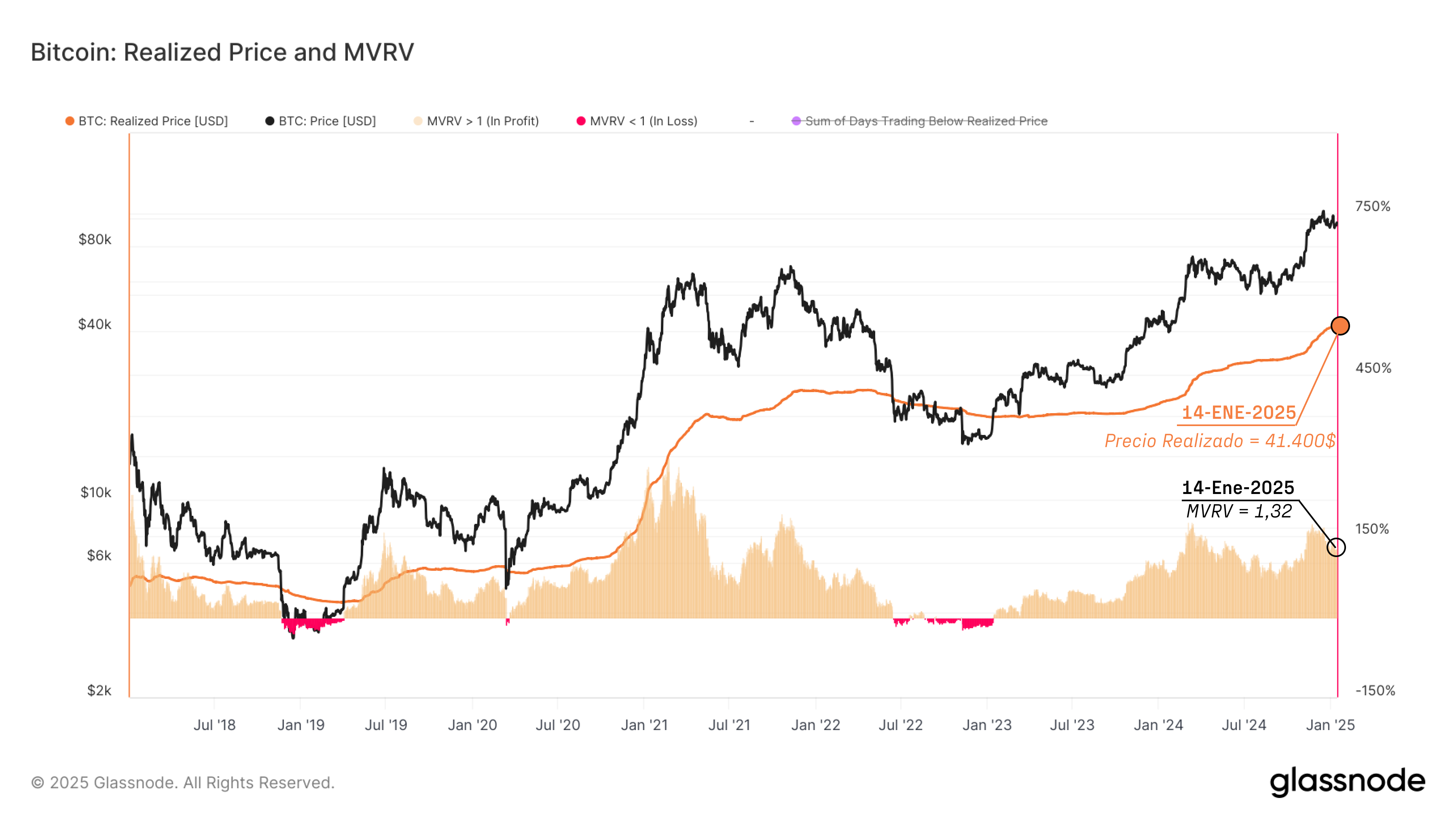 El Precio Realizado refleja el precio promedio al que todo el Bitcoin en circulación se ha movido por última vez dentro del blockchain, representando así el coste base agregado del mercado. El Ratio VMVR (Valor de Mercado y Valor Realizado) es una proporción entre el precio spot y el Precio Realizado, y mide la magnitud de las ganancias no realizadas medias. Valores por encima de 1 indican una ganancia no realizada, mientras que rondar por debajo de 1 sugiere una pérdida no realizada.