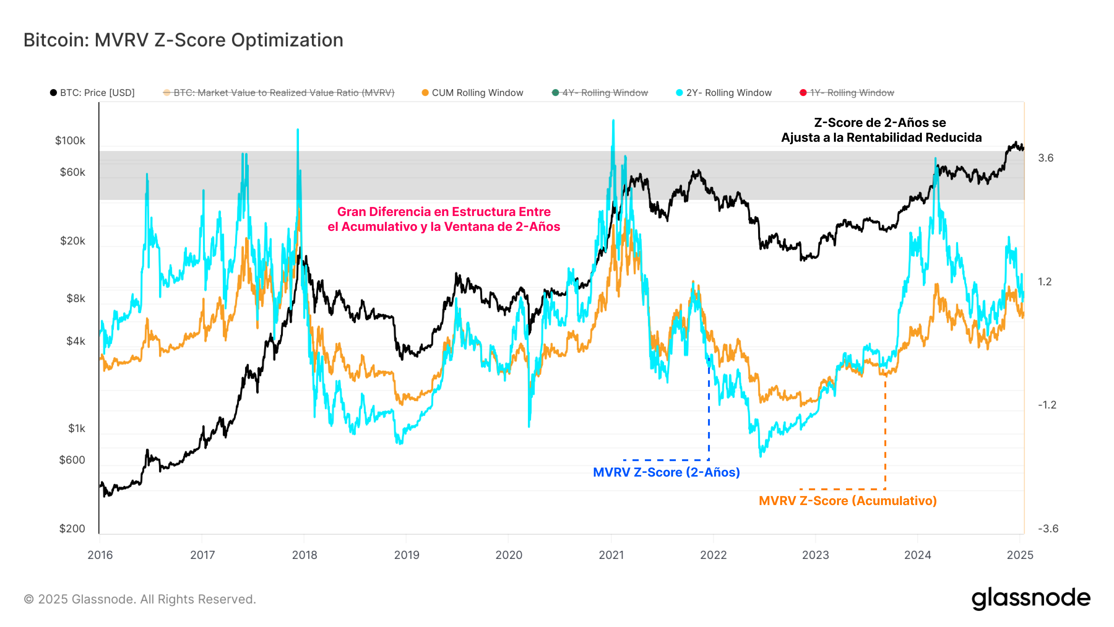 El uso de todo el histórico para calcular la Puntuación Z del VMVR puede generar distorsiones en los resultados, ya que los ciclos más antiguos con picos mucho más elevados sesgan tanto la media como la desviación estándar, haciéndolas menos representativas de las condiciones actuales del mercado.