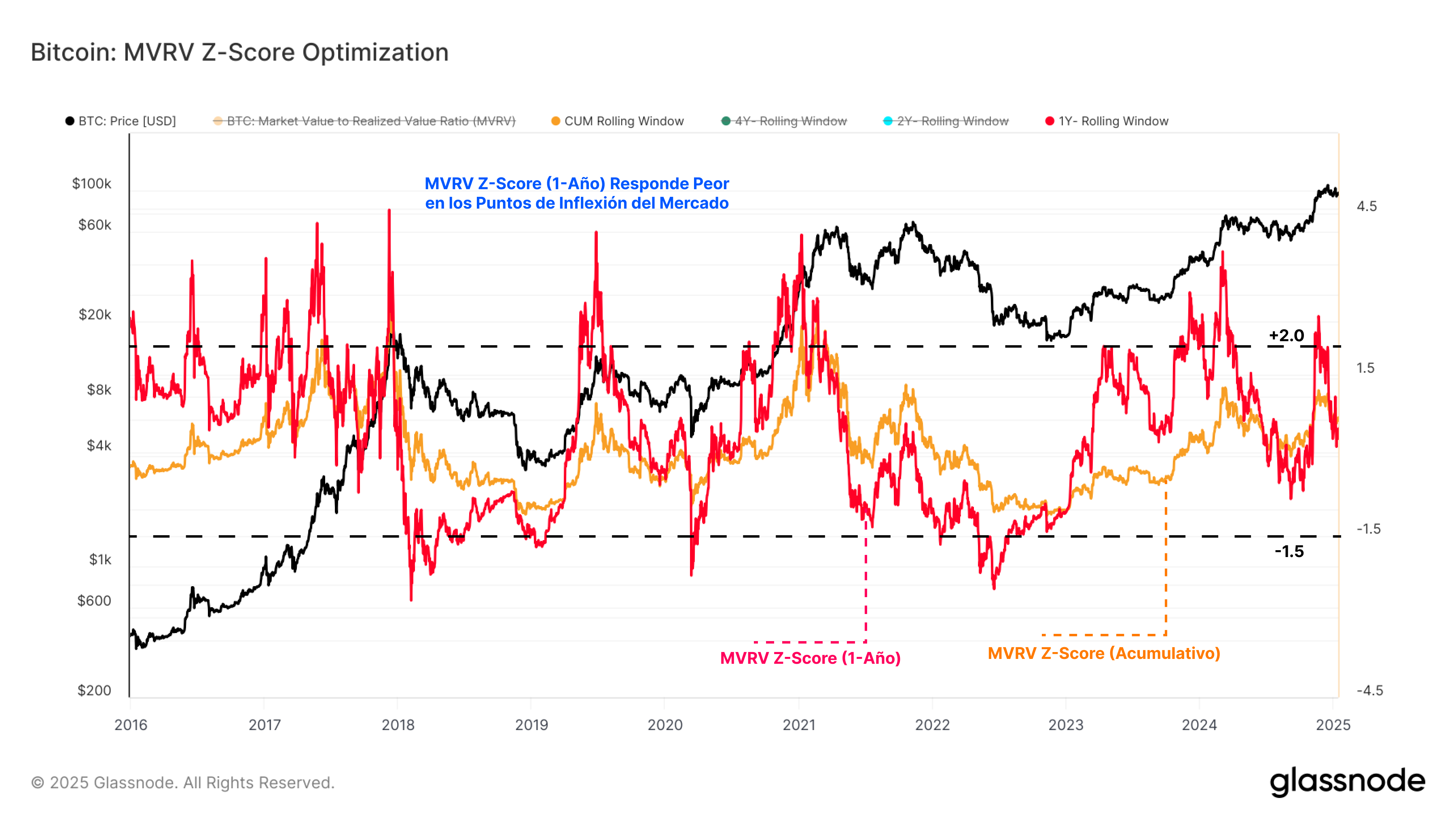 Esta Puntuación Z del VMVR mejorado nos aporta un marco más reactivo para identificar puntos clave de inflexión en el mercado a lo largo del ciclo y ayuda a compensar la tendencia general a disminuir que tienen los picos que alcanzamos cerca de los extremos absolutos.