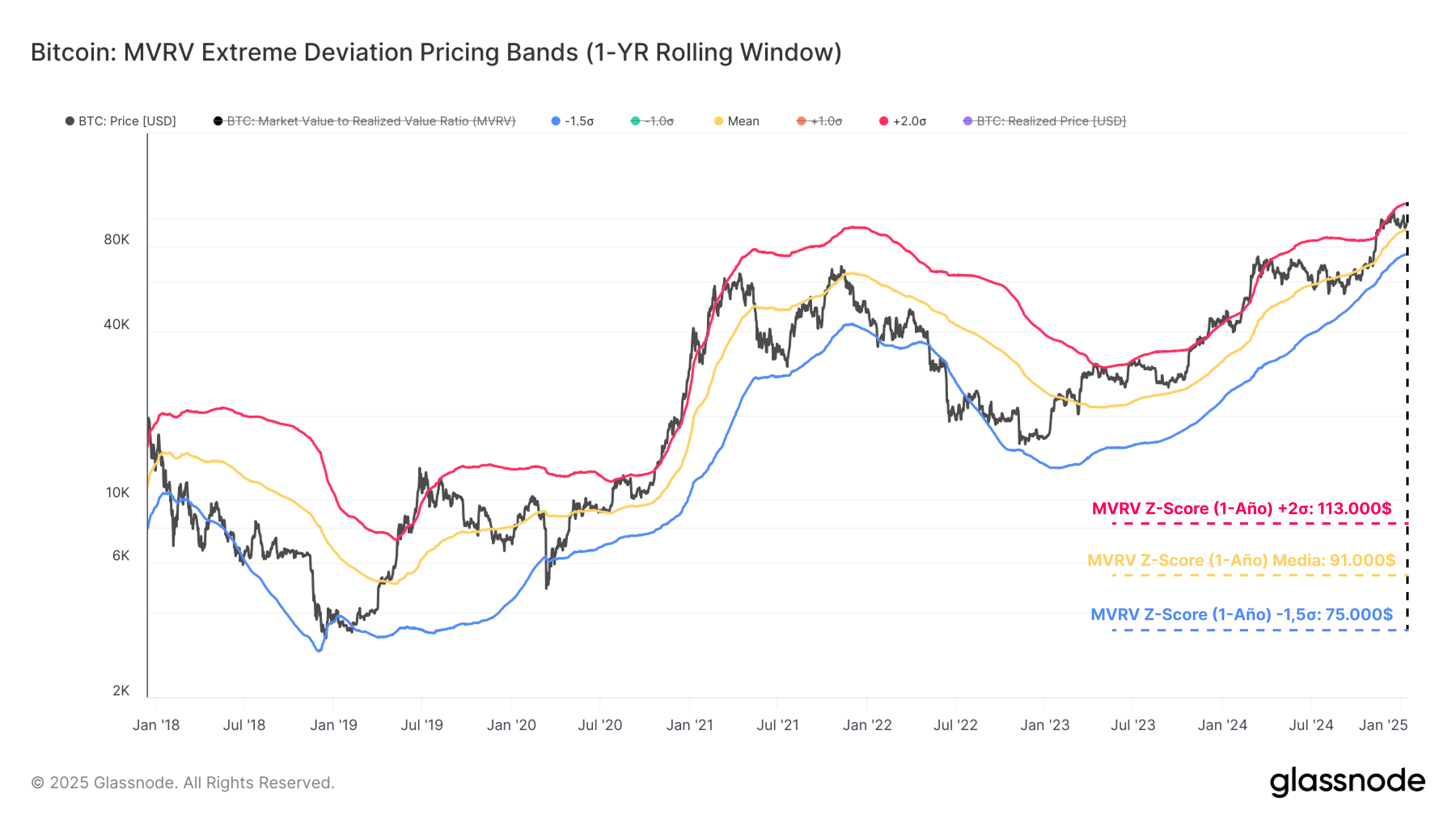Actualmente, Bitcoin cotiza a 94.398$, posicionándose por encima de la media móvil de 1 año, ubicada en los 90.900$, pero por debajo del umbral de las +2σ, situado en los 112.600$. Esto nos sugiere que el mercado sigue en una fase alcista, aunque ha retrocedido ligeramente desde los niveles de euforia más recientes, cuando sí se encontraba por encima de la banda superior.