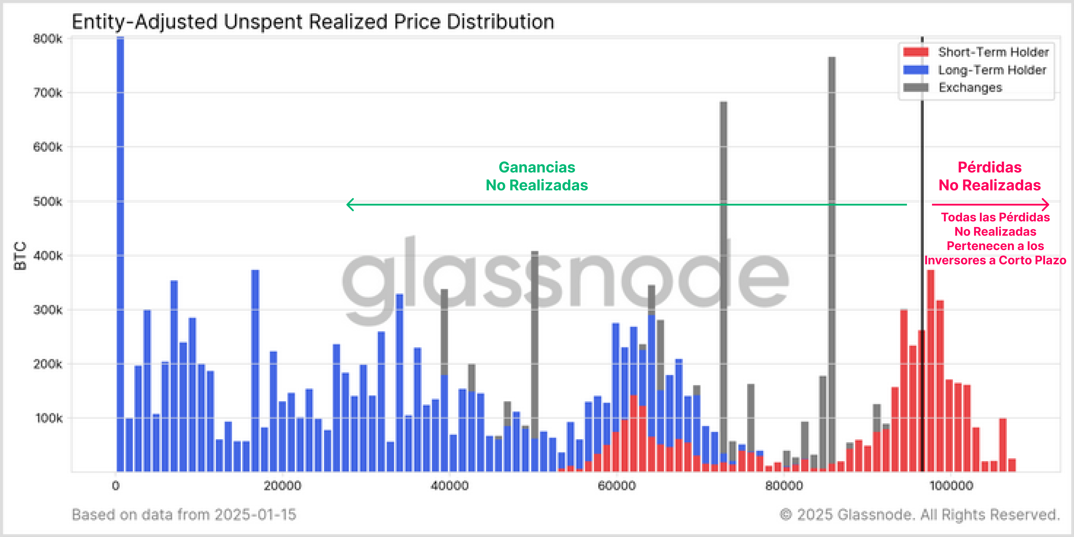 - Las pérdidas no realizadas están concentradas entre los inversores a corto plazo, con entre 2,0M y 3,5M BTC en rojo, lo que denota que tenemos un nivel de estrés moderado en el mercado.