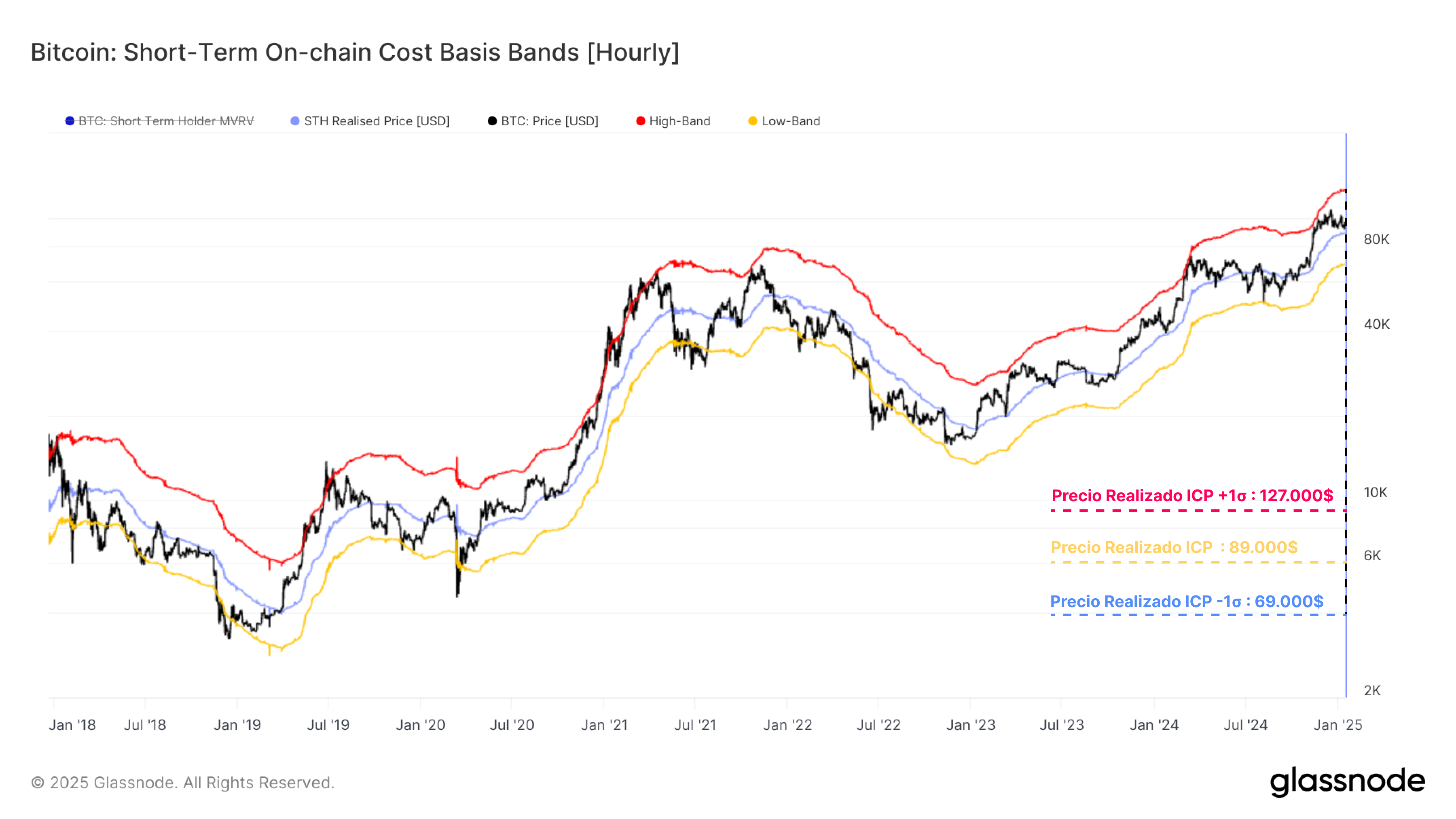 El coste base medio de los Inversores a Corto Plazo actualmente se sitúa en los 88.400$. Basándonos en un enfoque estadístico similar al anterior, definimos también una banda superior (125.500$) y una banda inferior (68.500$), que representan los límites típicos en la acción del precio durante mercados alcistas y bajistas, respectivamente.
