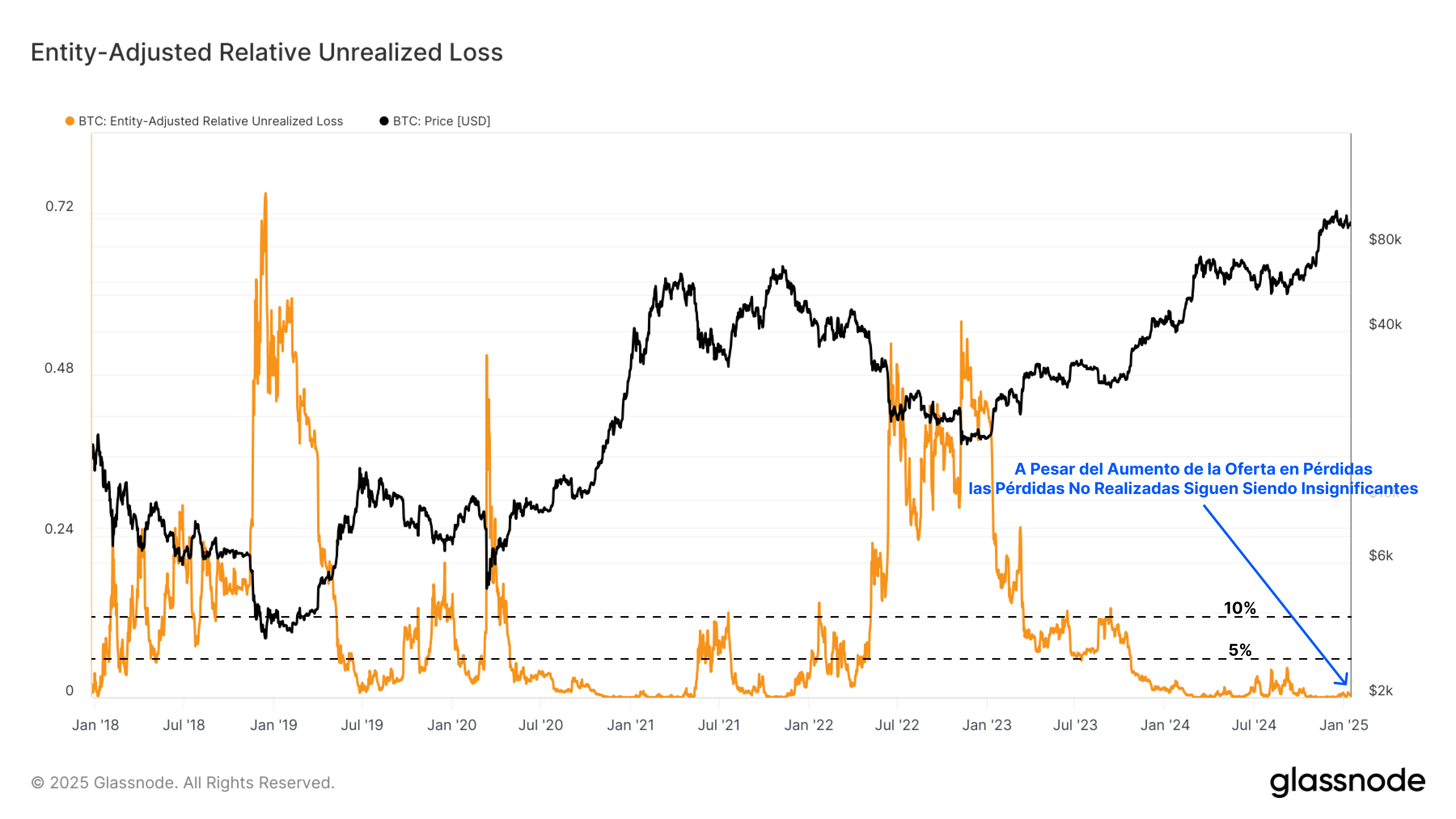 Otra manera de medir el nivel de dolor financiero en el mercado es la métrica de las Pérdidas No Realizadas Relativas, que calcula la proporción de pérdidas no realizadas (en USD) en relación con la capitalización de mercado. Al revisar los ciclos más recientes, surgen paralelismos entre el mercado actual y el mercado alcista del 2016–17.