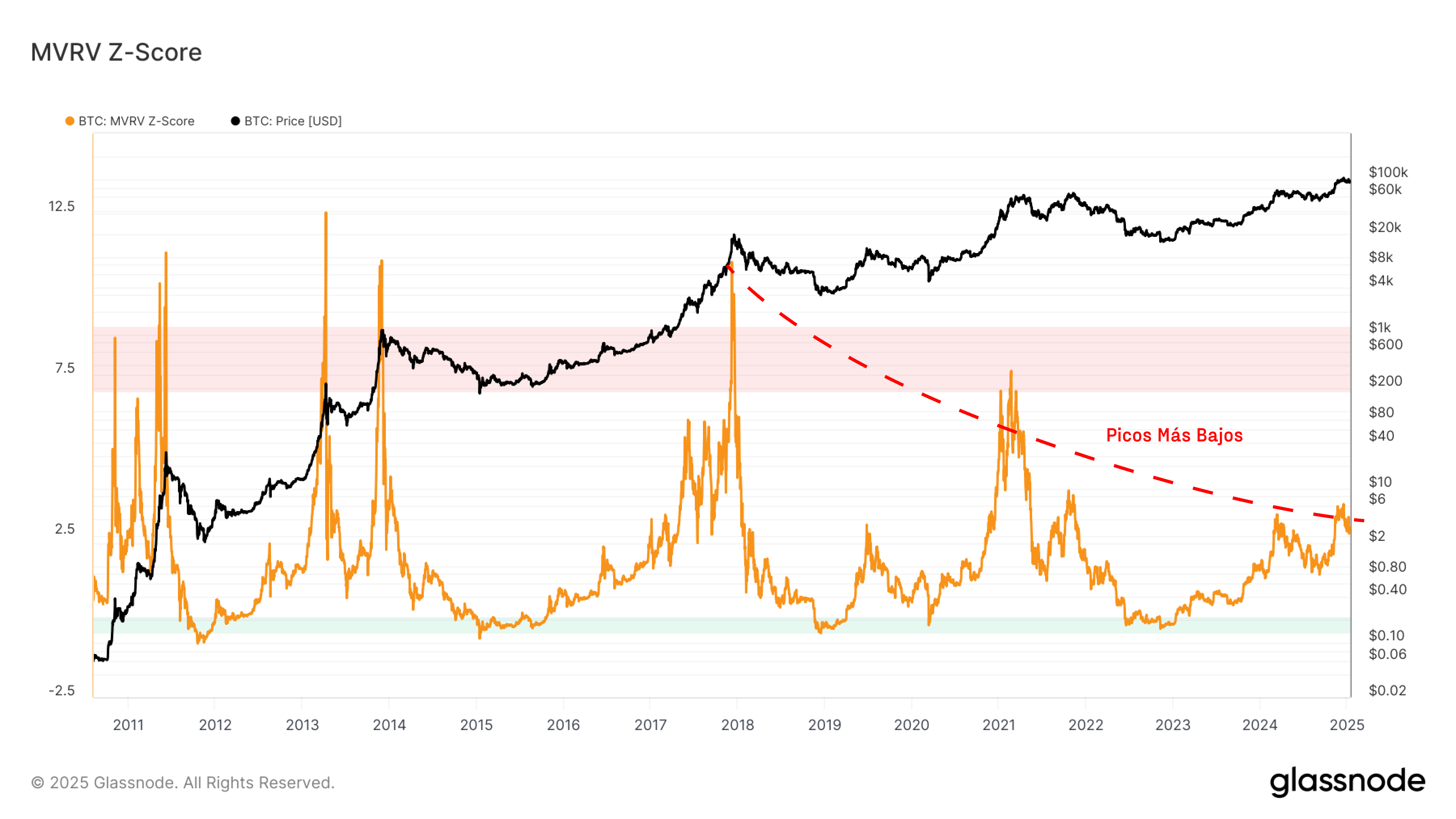 Esta tendencia a la baja muestra una reducción gradual en la volatilidad y la intensidad especulativa a medida que el mercado gana envergadura y liquidez. Además, nos sugiere que, aunque Bitcoin sigue rigiéndose por tendencias cíclicas, cada pico se vuelve relativamente menos exagerado, alineándose con una estructura de mercado más madura y eficiente.