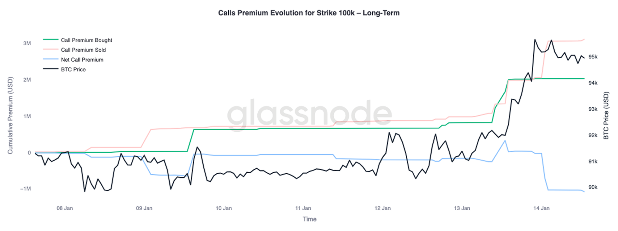 Un análisis más detallado del comportamiento de la prima en el strike de los 100.000$ revela una divergencia muy clara entre vencimientos. Este nivel sigue siendo el próximo umbral psicológico de referencia, y los flujos de opciones muestran con precisión cómo se está posicionando el mercado alrededor de él.