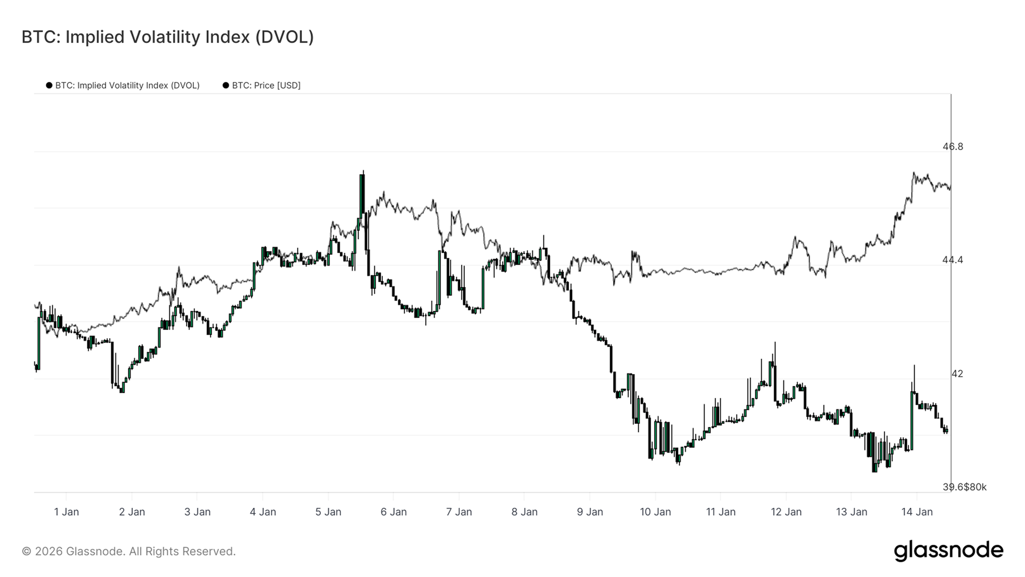 En estos momentos, el DVOL se mantiene relativamente bajo y acotado en un rango estrecho, a pesar de que el precio spot ha atravesado niveles clave. Esto confirma lo que ya sugieren tanto la estructura temporal como la inclinación del mercado: el mercado de opciones no está pagando más por volatilidad inmediata. La incertidumbre existe, pero no se está expresando con un encarecimiento generalizado del riesgo implícito.