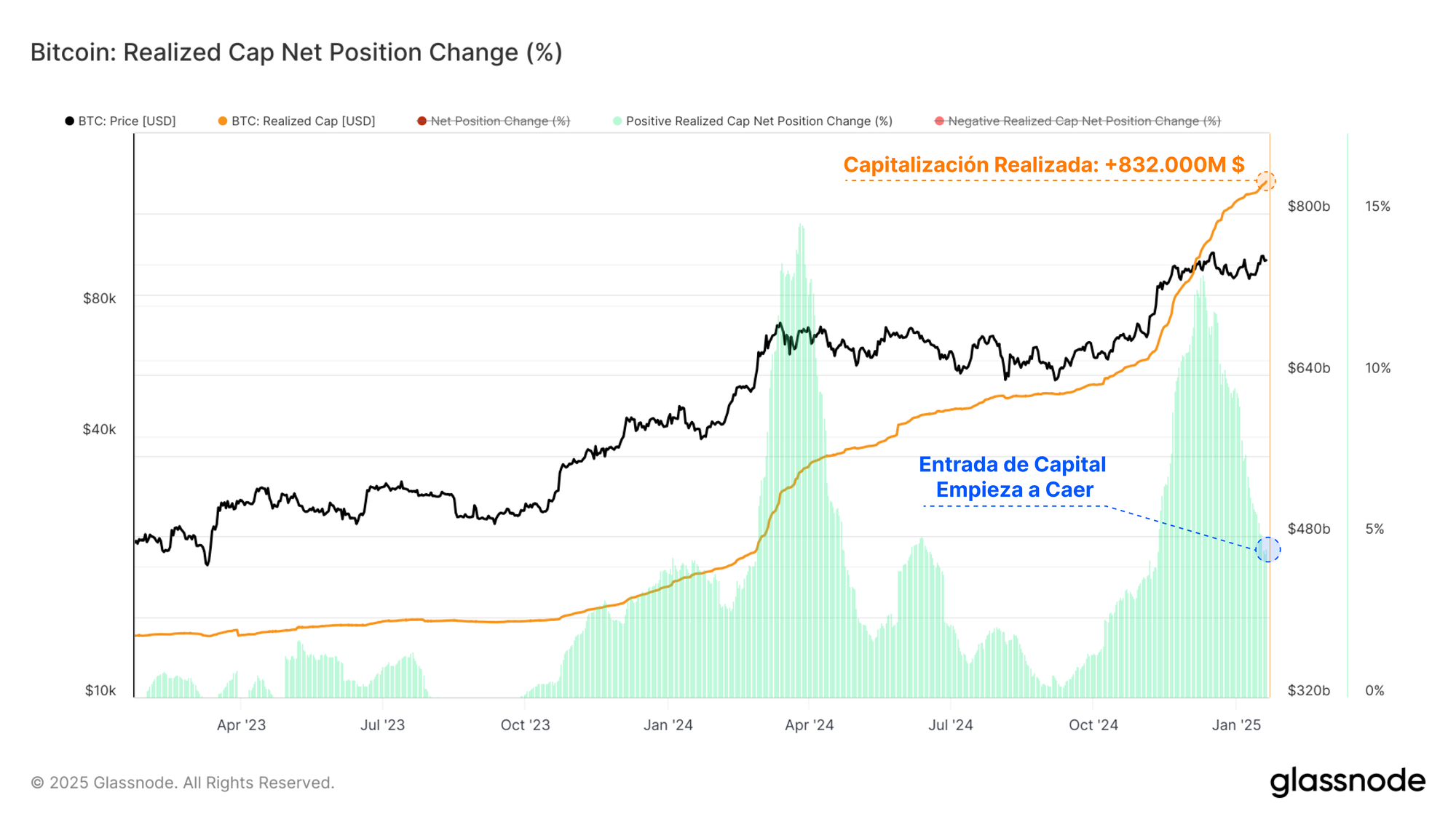 La Capitalización Realizada está actualmente en su máximo histórico, con un valor de nada menos que 832.000M $ y creciendo a un ritmo de 38.600M $ al mes.
