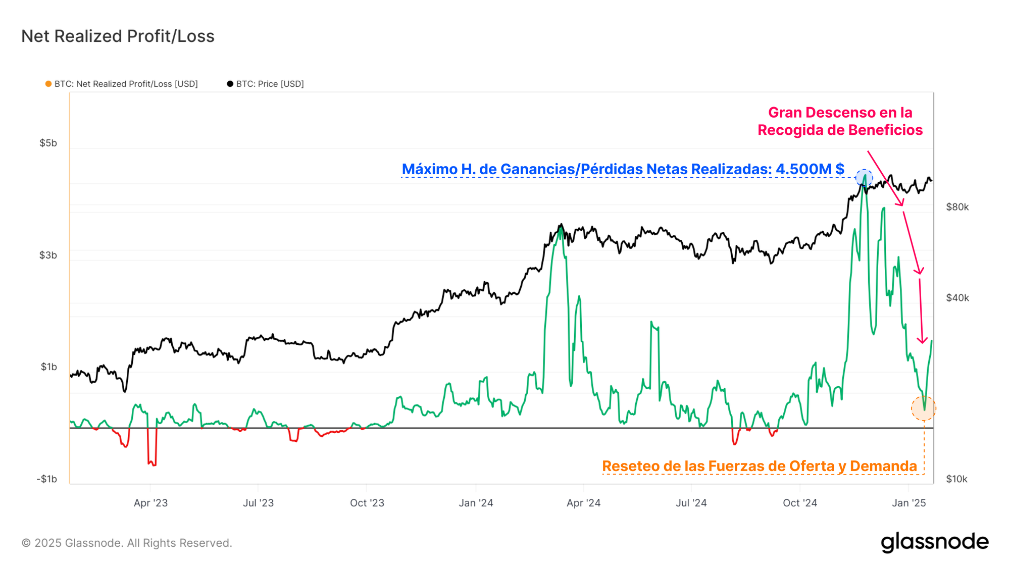 El indicador de las Ganancias/Pérdidas Netas Realizadas es la primera derivada de la Capitalización Realizada, y nos permite observar la envergadura de los flujos netos de capital que tienen lugar dentro del blockchain, denominados en términos de USD.