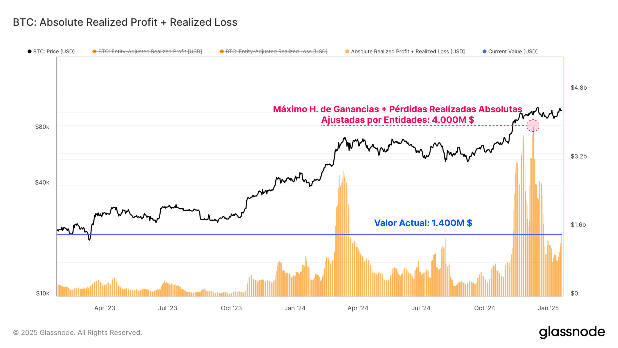 La magnitud absoluta de las Ganancias y Pérdidas Realizadas (ajustadas por entidad) es otra herramienta que nos ayuda a evaluar la dirección y el sentimiento del capital que fluye hacia dentro y fuera de Bitcoin.