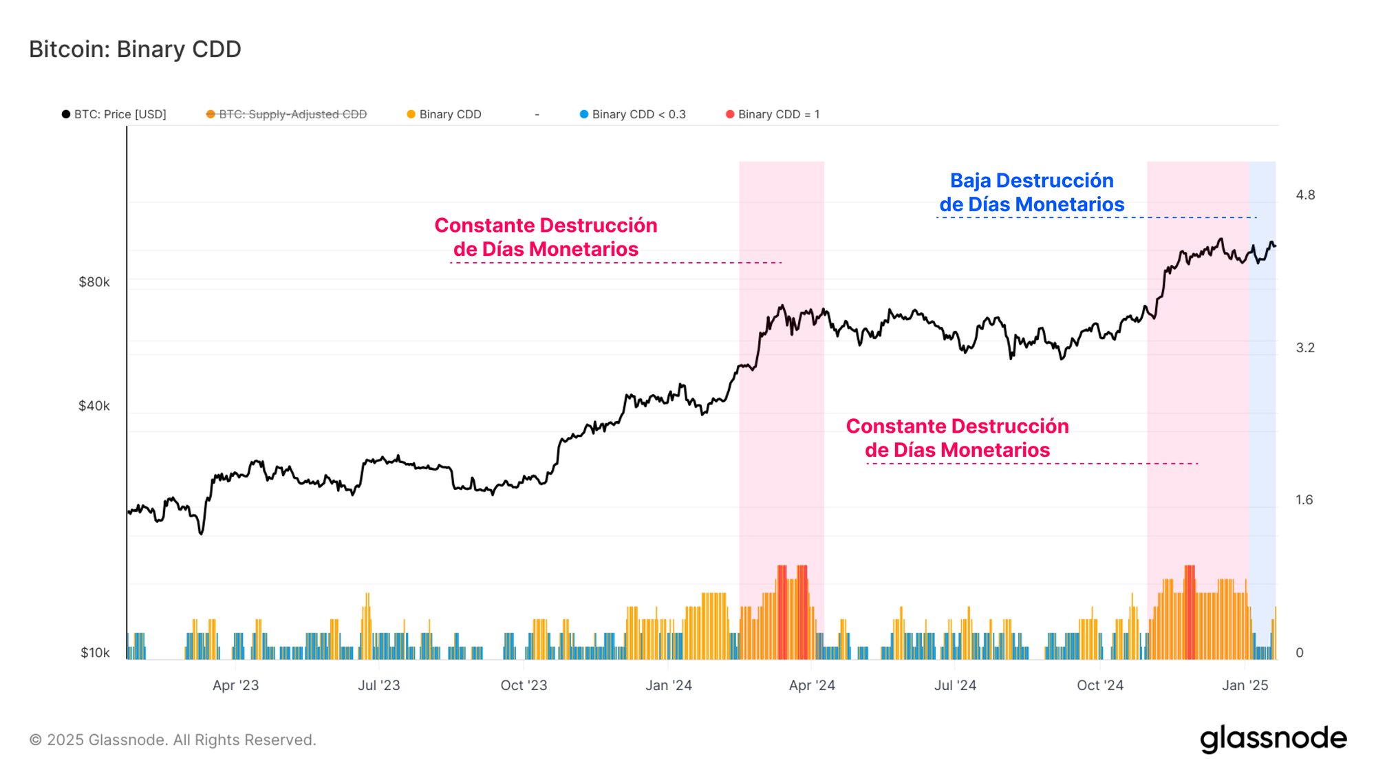 En el último trimestre de 2024 y principios de enero, se ha mantenido un periodo de intensa destrucción de días monetarios. Sin embargo, en las últimas semanas, esta métrica ha comenzado a desacelerar, y ahora predomina una destrucción mucho más moderada.