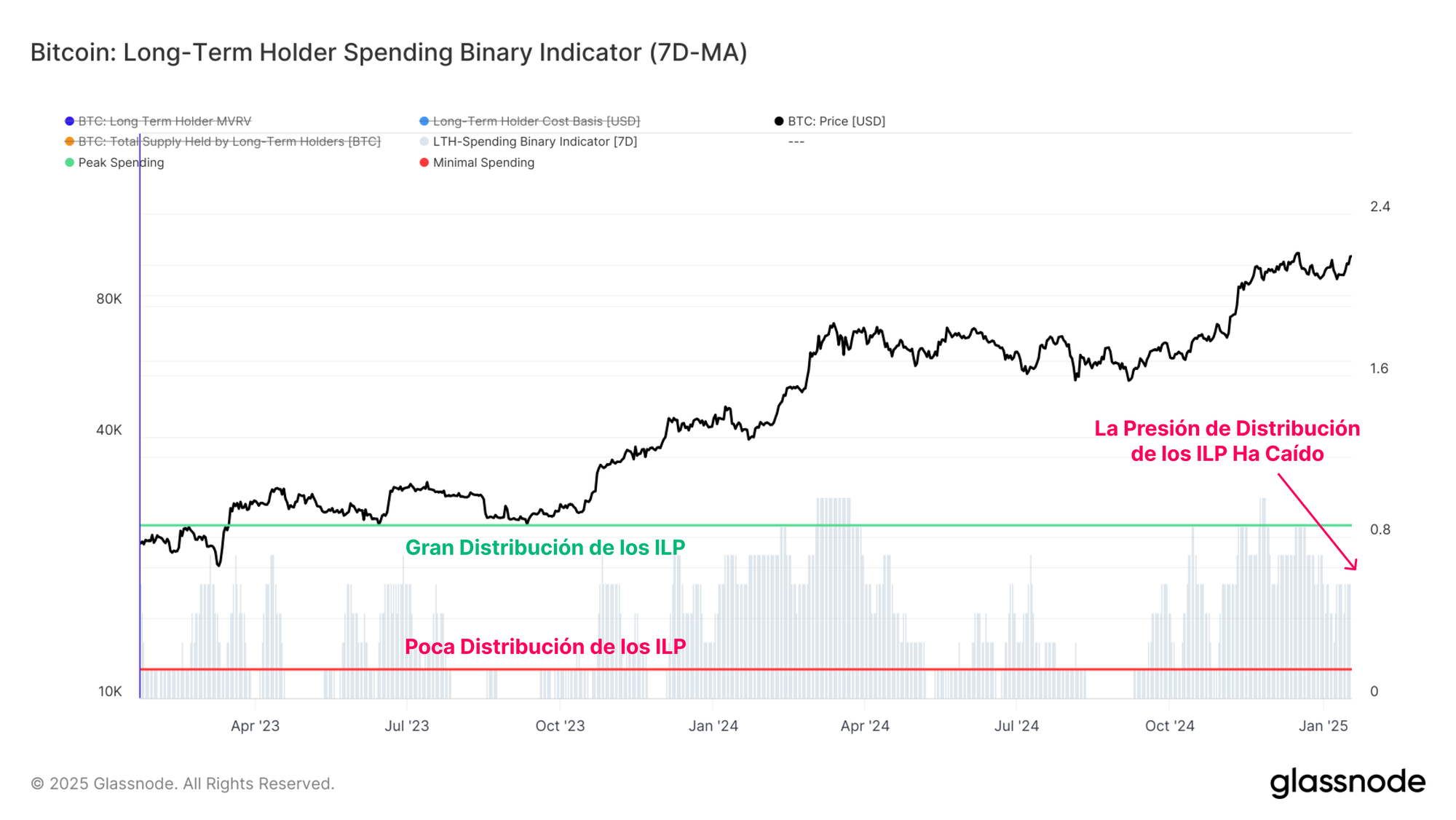 El Indicador Binario de Gasto de los Inversores a Largo Plazo (ILP) es otra métrica útil para evaluar la duración de la presión de venta a la que está sometida el mercado, esta vez centrándonos específicamente en los inversores a largo plazo.