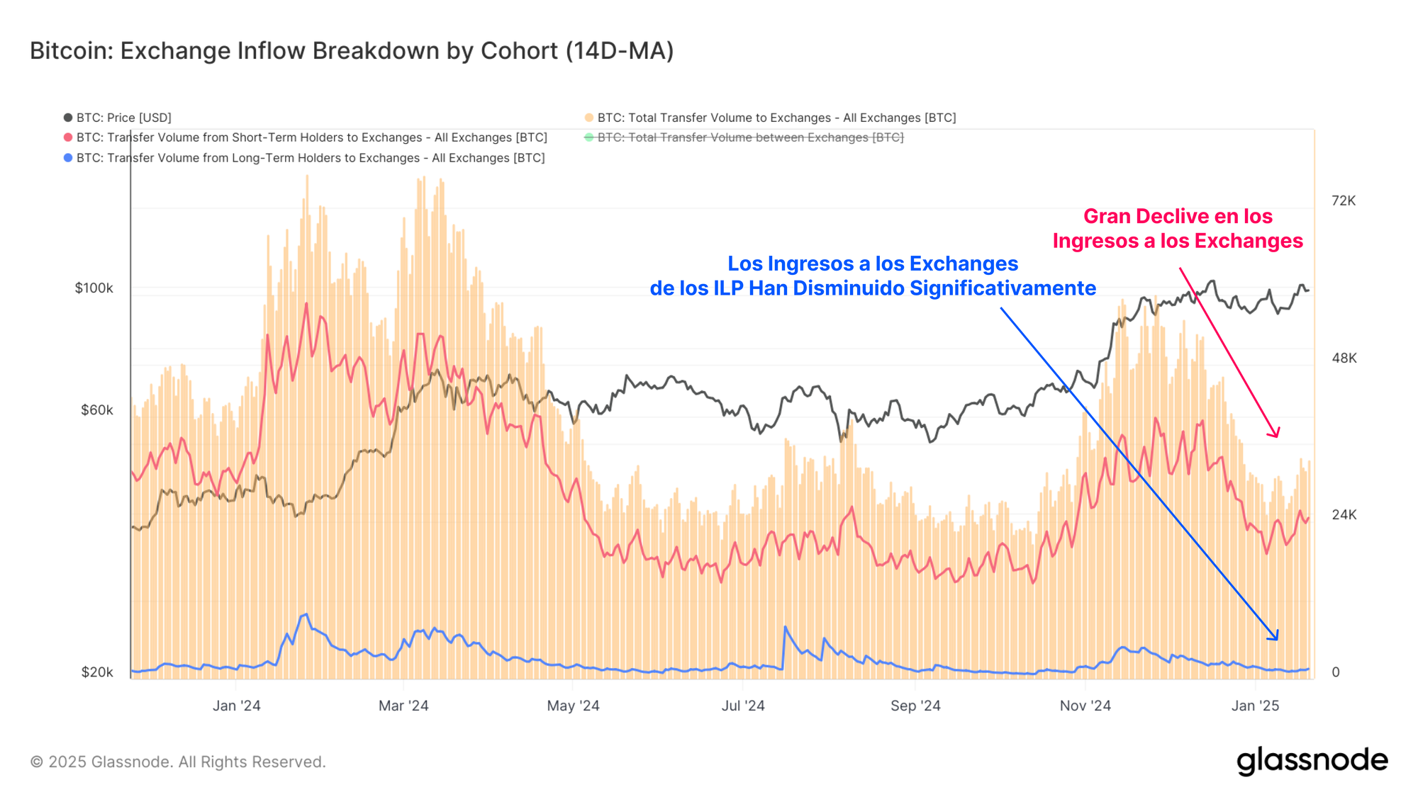 Hay que destacar especialmente que el volumen de entrada de los Inversores a Largo Plazo (ILP) en los exchanges han caído desde los 526,9M $ en diciembre hasta un valor actual de sólo 92,3M $, lo que representa un descenso del 83% en el volumen de depósitos.